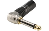 Разъем HICON JACK 6,3 мм угловой 90° (моно) NOISEFREE (бесшумное подключение), штекер на кабель диаметром до 7,0 мм, монолитный позолоченный TIP контакт, контакты под пайку, количество контактов - 2, клеммный кабельный зажим, металлический черный корпус |