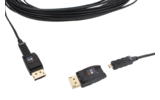 DPFC-200D-50 – гибридный (волоконно-оптический + медный) активный кабель с разъемами DisplayPort (вилка-вилка) для передачи сигналов разрешением до 4096x2160/60 (4:4:4), 3D с поддержкой DisplayPort 1.2 без сжатия изображения. Для удобства монтажа разъемы могут сниматься. Питание подается на приемник и передатчик по разъему DP. Дополнительный источник питания для передатчика и/или приемника заказывается отдельно. Длина кабеля 50 м. |