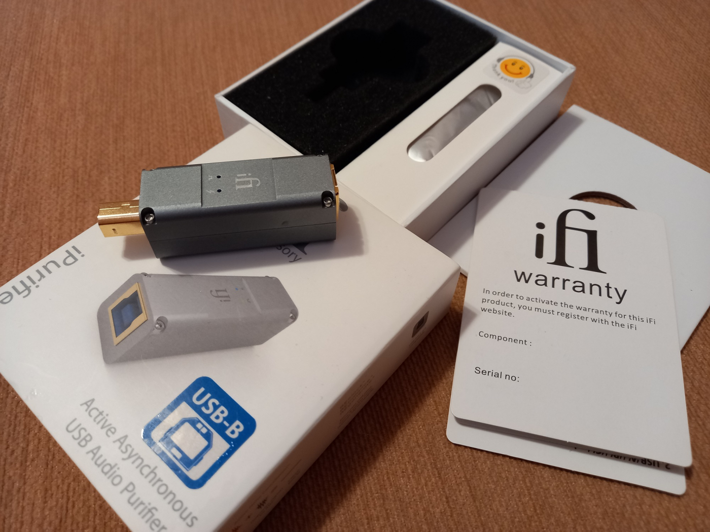 Оптимизатор звукового поля iFi Audio Accessory iPurifier2 (Type B), стал не нужен после модернизации USB интерфейса. Как начальное устройство, весьма хорошо справляется со своими задачами - не сушит, не рвет поток, убирает резкость в силу своей стоимости - не сомневайтесь. Один нюанс - не работает под выводом через плагин WASAPI, только под ASIO. В рабочем состоянии, косметика тоже не высоте. Потерян только переходник Type B-A, да он и не нужен по большому счету.