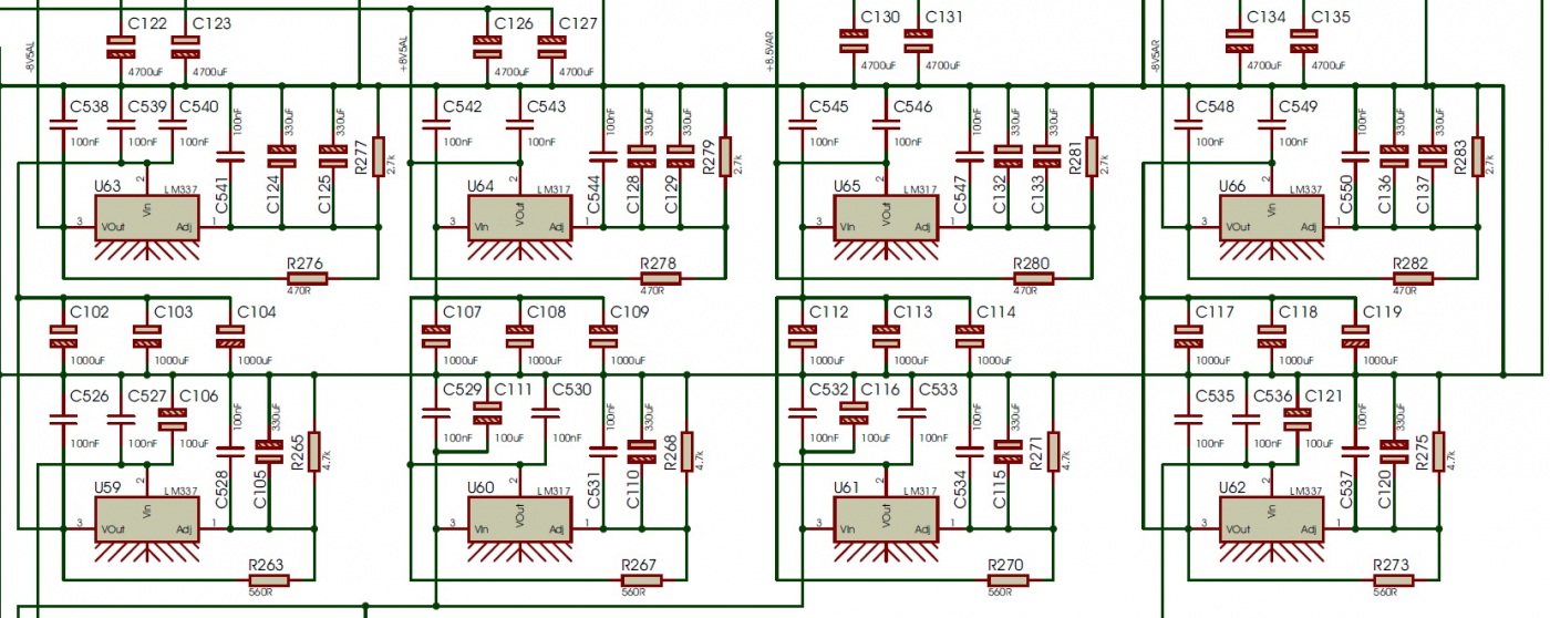 Это еще на вся схема стабилизаторов, только вторичная ее часть. Есть еще одна - первичная после выпрямителя непосредственно.