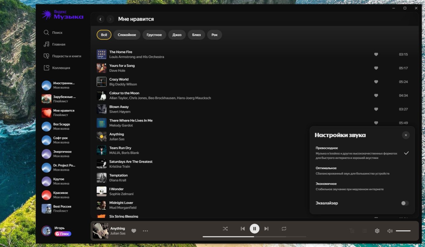 Слушаю Я. Музыка в формате FLAC. Есть и другие, менее качественные с битрейтом 320 и 192 Кб/c , то есть обычный формат MP3. Давно им не пользуюсь, не нравится мне эта "сухо мять", если обобщенно. А вот для формата Lossless нужен Интернет с хорошей скоростью, не менее 100-250 мб/с, но чем выше, тем лучше. У меня тариф "игровой" - 350 мб/с, честно даже грех жаловаться. А использую программное приложение от Я. Музыка...
