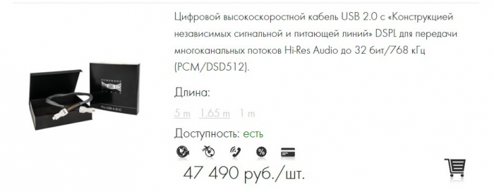 Рекомендованная розничная цена в России: 47490 руб. И это полностью российский продукт. И на данный момент наш самый совершенный USB кабель, который по уровню музыкальной достоверности призван успешно соперничать с самыми лучшими образцами на рынке, будучи при этом сравнительно недорогим!