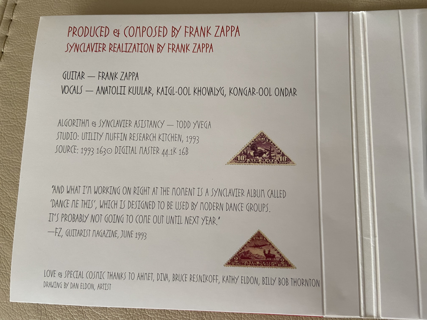Из инструментов - Synclavier DMS и гитара (последняя гитарная запись Заппы), на вокале - ансамбль горлового пения из Республики Тыва под управлением Конгар-оол Борисович Ондар