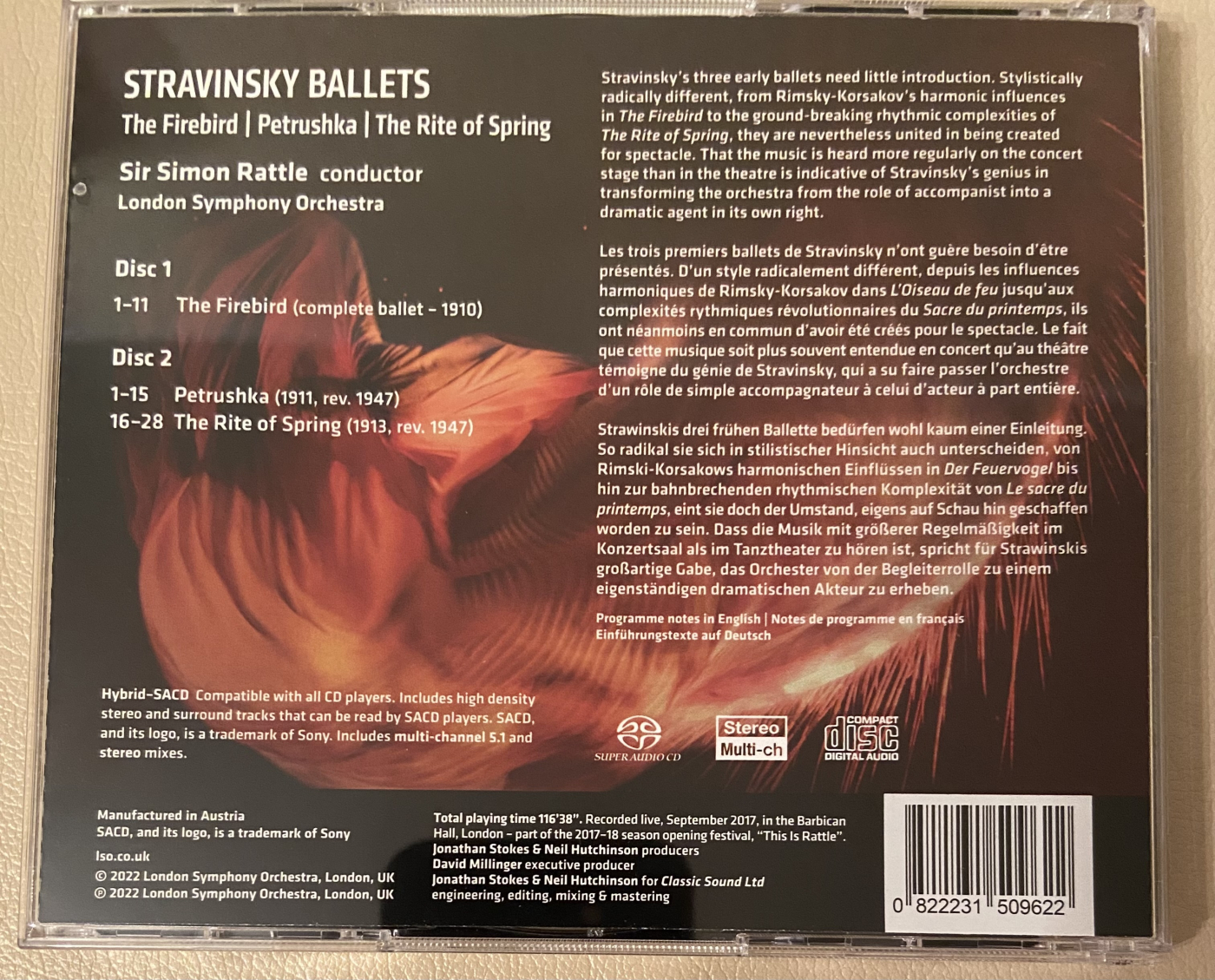 Для сэра Саймона Рэттла все три балета стали центральными в его долгой и выдающейся дирижерской карьере. 22-летним юношей он впервые записал "Весну" с Национальным молодежным оркестром Великобритании. Затем Рэттл записал эти балеты для EMI во время своей работы в CBSO и продолжил их исполнение в качестве главного дирижера Берлинского филармонического оркестра. Данный релиз LSO Live был записан 21 и 24 сентября 2017 года в Барбикане в рамках сезона 2017-2018 годов, который ознаменовал начало работы дирижера в качестве музыкального руководителя LSO. Волнение этого живого концерта ощущается во всем исполнении, а безграничная виртуозность оркестра всегда служит музыке.