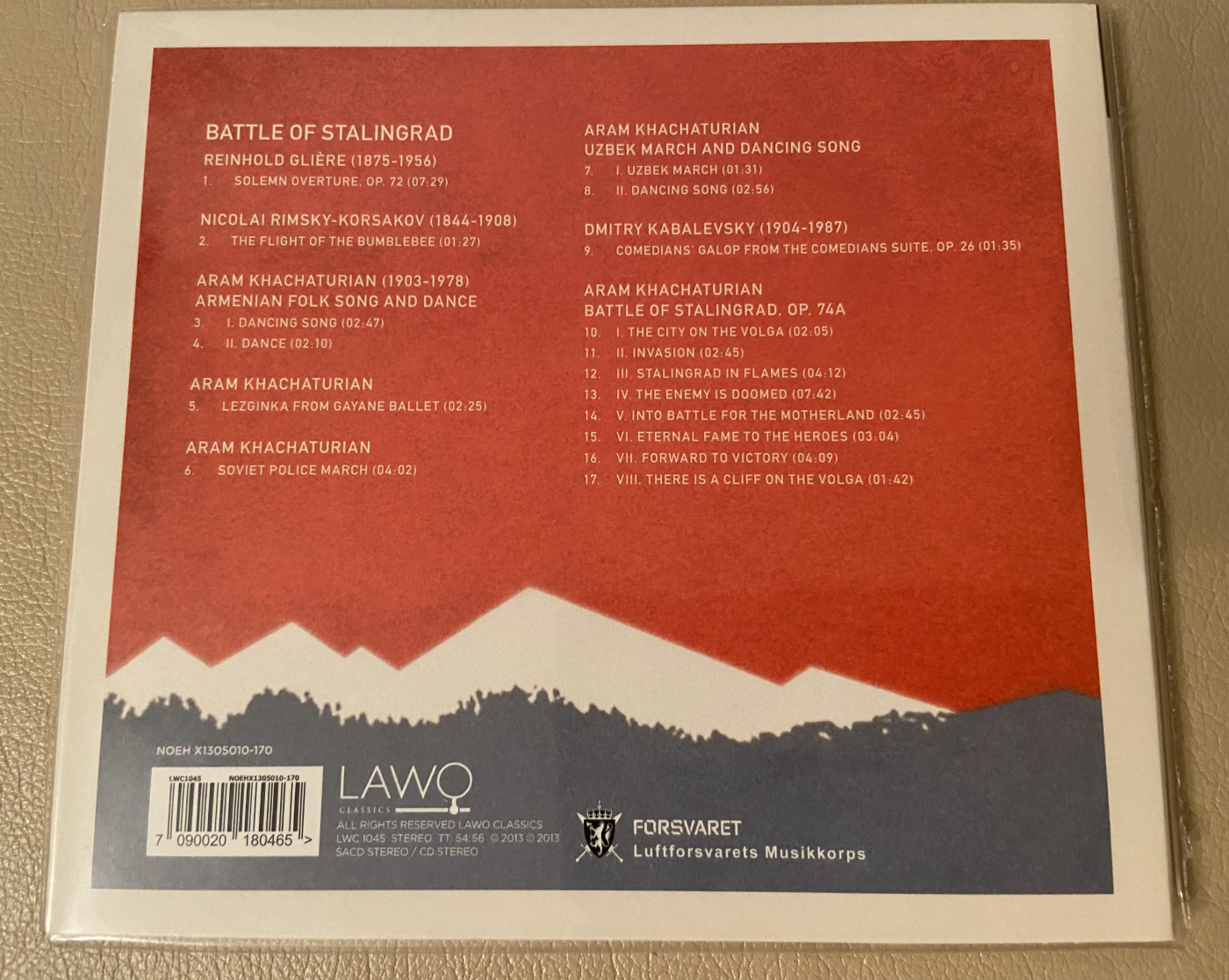 Большая часть музыки в этой программе русской оркестровой музыки написана Арамом Хачатуряном (1903-1978) и восходит к «Искусству страха» для музыкантов сталинского режима. Две более легкие пьесы, однако, как бы заквашивают хлеб, и по случайному совпадению обе стали международными фаворитами. Римский-Корсаков (1844-1908) умер до русской революции 1917 года, но его «Полет шмеля» сделал его известным во всем мире. Это технически сложное произведение взято из оперы Римского-Корсакова «Сказка о царе Салтане», ор. 57. Она звучит как прелюдия к III акту, где царевич спасает лебедя, на которого напала пчела-шмель. Возможно, некоторые из оркестра Королевских ВВС Норвегии являются пчеловодами, потому что их виртуозная игра и детальная передача оркестровых инструментов в прекрасной записи делают эту погоню за лебедем одной из самых убедительных, которые я слышал. Здесь использована искусная аранжировка Герадо Ласилли для духового оркестра, но обратите внимание, что сам Римский был инспектором оркестров русского флота, писал и аранжировал для оркестров.