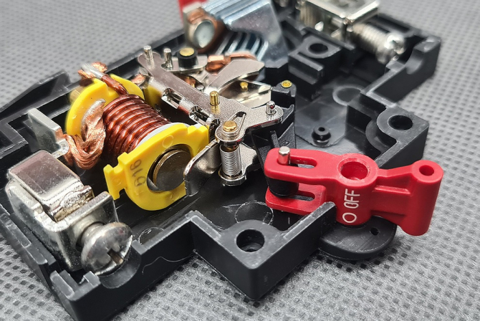 На заднем фоне это хорошо видно. Это фото уже Китайского, корпус у него прямоугольный в отличии от оригинала, но сути по начинки не меняет - одинаково у обоих. Как видно, ток проходит через катушку магнитного расцепителя и далее медный рычаг контактора с серебряным пятаком. Ответная часть тоже имеет медный рычаг с серебром, а это дело прикрывает искрогаситель... Вроде бы обычная конструкция автоматического выключателя, за исключением отсутствия в нем биметаллической пластины... Но тем не менее, целая цепочка последовательных переходов, помимо серебряных контактов. Что же у предохранителя... Его не разбирал, но и так понятно - всего одна плавкая нить, что соединяет контактные колпаки с двух сторон. Скажу так, похоже что GigaWatt G-16 так и останется в положении "OFF", уступил он Hi-Fi Tuming Modular со вставленным в нем предохранителем LittelFuse 16A 10x38, ровно по тем причинам, что указал по влиянию серебра на звук ранее.
