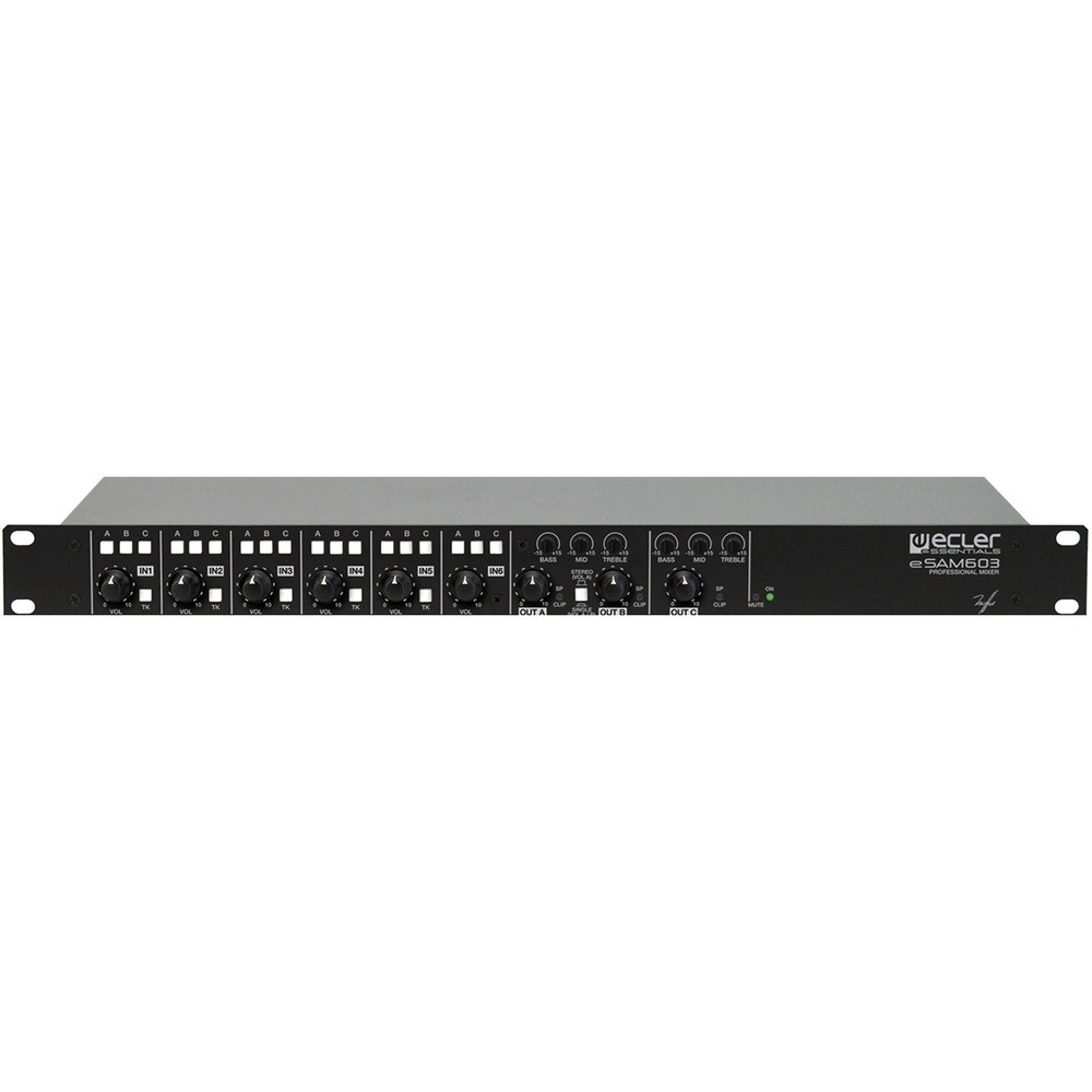 eSAM603 – шестиканальный микшер с четырьмя входами балансного микрофонного / линейного сигнала с фантомным питанием 18 В, одним небалансным стереовходом, одним входом микрофонного уровня, с эквализацией. Имеется дополнительный стереовыход для записи (AUX). Устройство поддерживает приоритетность сигналов.