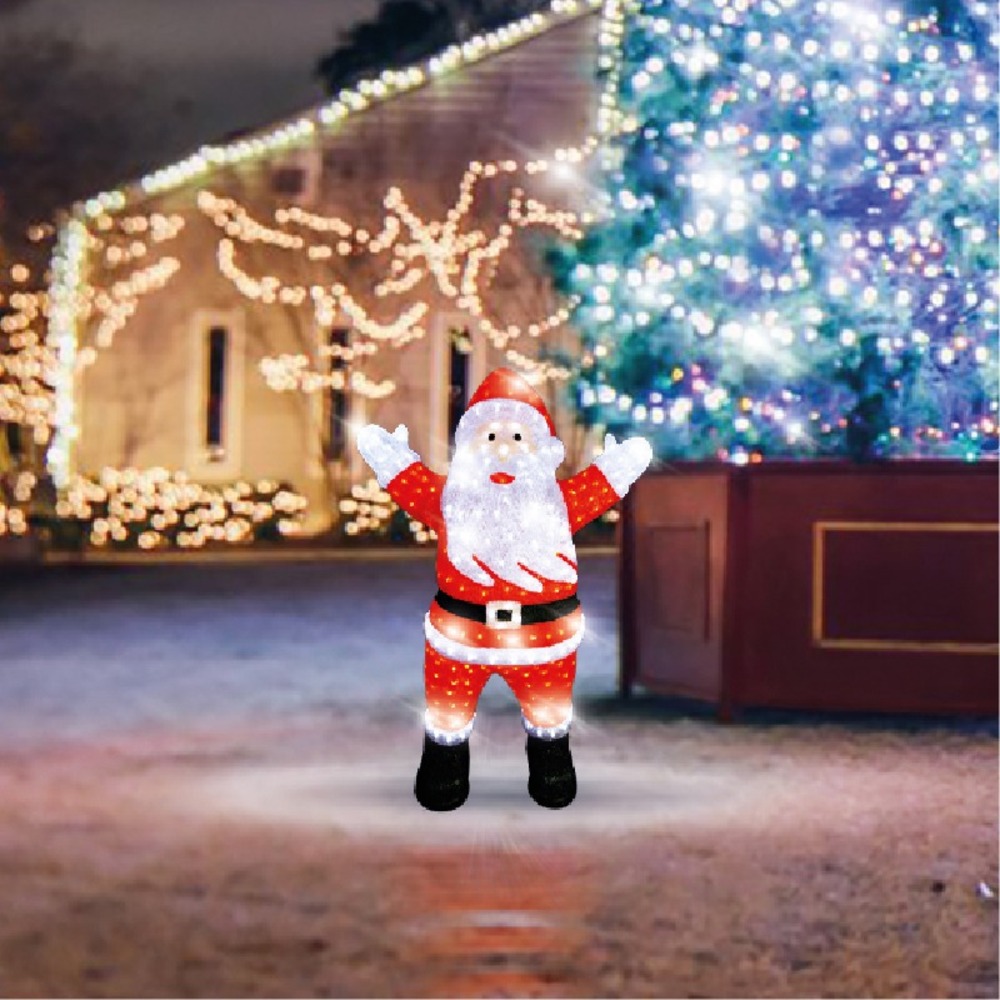 Акриловая светодиодная фигура NEON-NIGHT «Приветствующий Санта Клаус» высотой 120 см, светящаяся более чем 320 яркими диодами, выполнена по специальной технологии нанесения акрила. Она позволит вам создать ту самую, настоящую новогоднюю атмосферу и принести сотни радостных улыбок. Акриловые фигуры за несколько лет вызвали большой интерес у дизайнеров и частных клиентов. С каждым годом расширяется не только ассортимент акриловых фигур, но и появляются новые технологии нанесения акрила. Эти яркие, светящиеся объемные фигуры, состоящие из металлического каркаса, акрила и светодиодов, применяются для оформления и создания новогодней атмосферы в кафе, ресторанах, торговых центрах, магазинах, на площадях и перед входом, а также просто в частных домах и квартирах. Все фигуры укомплектованы понижающим трансформатором , что обеспечивает безопасность при контактировании, а также имеют степень защиты IP65, что позволяет использовать их как в помещении, так и на улице.