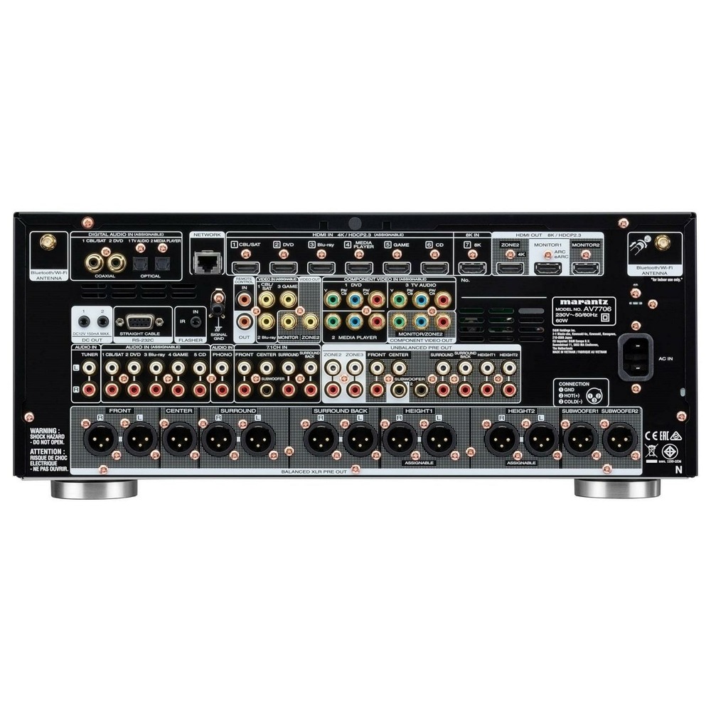 Как и ресивер, процессор Marantz AV7706 поддерживает подключение HDMI 2.1, пропуская видеосигнал 8K 60 Гц, либо особо востребованный в гейминге вариант 4K 120 Гц. Система eARC позволит адаптировать управление громкостью телевизора ко всей системе. Предусмотрены ALLM, HDR10+, VRR, QMS и QFT.