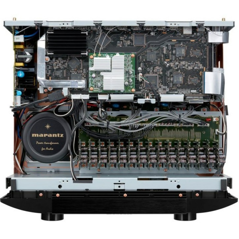 Технологии Marantz базируются на прочной и жесткой конструкции шасси – для наилучшего воспроизведения музыки и звуковых дорожек кинофильмов, а также на крупном тороидальном силовом трансформаторе и емких накопительных конденсаторах в блоке питания. Для совершенного разделения каналов использованы целых 17 модулей HDAM на отдельных платах. Медное покрытие основного шасси гарантирует отличное заземление в любой точке и значительно улучшает соотношение сигнал-шум.