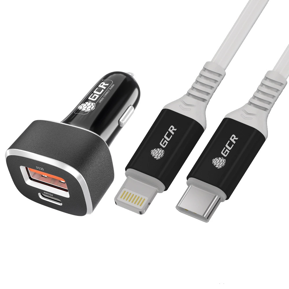 GCR Комплект автомобильное зарядное устройство на 2 USB порта QC3.0 + PD18W [TypeA + TypeC] + кабель 1.0m TypeC/Lightning, белый