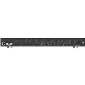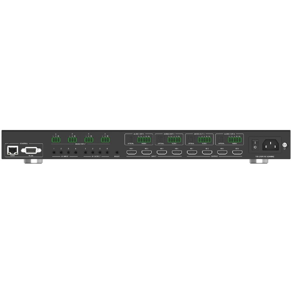 Матричный коммутатор 4x4 HDMI 2.0 со скоростью 18 Гбит/с позволяет осуществлять бесподрывную коммутацию источников сигнала с разрешением видео до 4K2K при 60 Гц YUV 4:4:4. Имеет функцию построения видео стен, а так же многооконного отображения источников на каждом выходе. Поддерживается эмбеддирование аналоговых аудио сигналов и деэмбеддирование аудио в аналоговый и цифровой формат. Управление с помощью кнопок передней панели, ИК-пульта дистанционного управления, RS-232, локальной сети и веб-интерфейса.