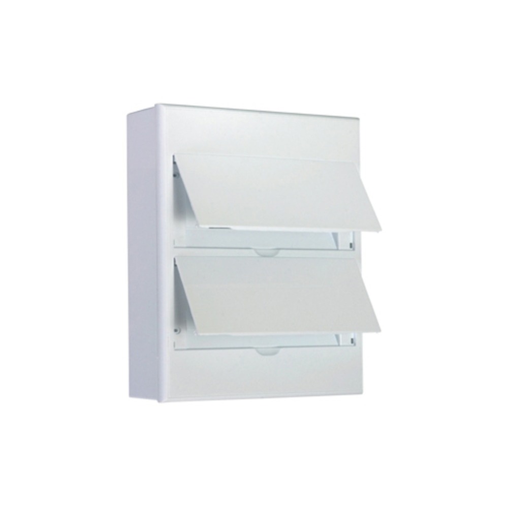 Бокс пластиковый ЩРН-П IP41 предназначен для установки модульных устройств при распределении электроэнергии до 400 В в квартирах, офисах, жилых, муниципальных и технических помещениях. Корпус состоит из лицевой и несущей частей, выполненных из надежных и долговечных материалов: прозрачная дверца изготовлена из поликарбоната, белая дверца – из ударопрочного ABS-пластика. Внутренняя часть корпуса с увеличенным пространством удобна для монтажа оборудования. Изделие выполнено в соответствии с нормами пожарной безопасности и изготовлено из материалов, которые не поддерживают горение. Современный дизайн позволяет устанавливать распределительный щиток в любое пространство. Внутри установлена стальная DIN-рейка для крепления на нее различных модульных устройств, в комплектацию также входит набор винтов для крепления. Произведено в Европе в соответствии со всеми стандартами безопасности (ГОСТ 14254 - 2015 и IEC 60529:2013). Технические характеристики: Количество рядов: 2 Количество модулей: 24 Вид установки: навесной Материал корпуса: ABS-пластик Цвет дверцы: белый Цвет: белый RAL 9010 Степень защиты: IP41 Рабочая температура: –25...+85 °С Размеры (ДхВхГ): 300х365х100 мм