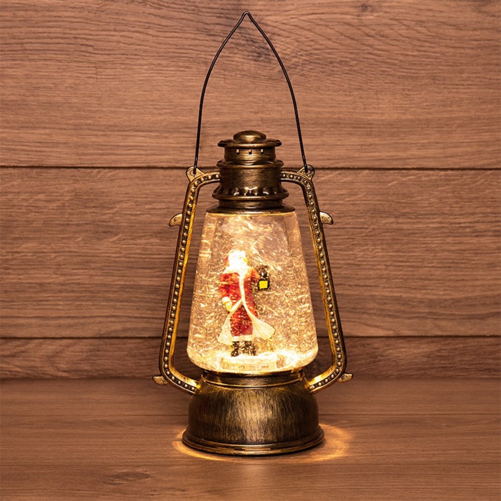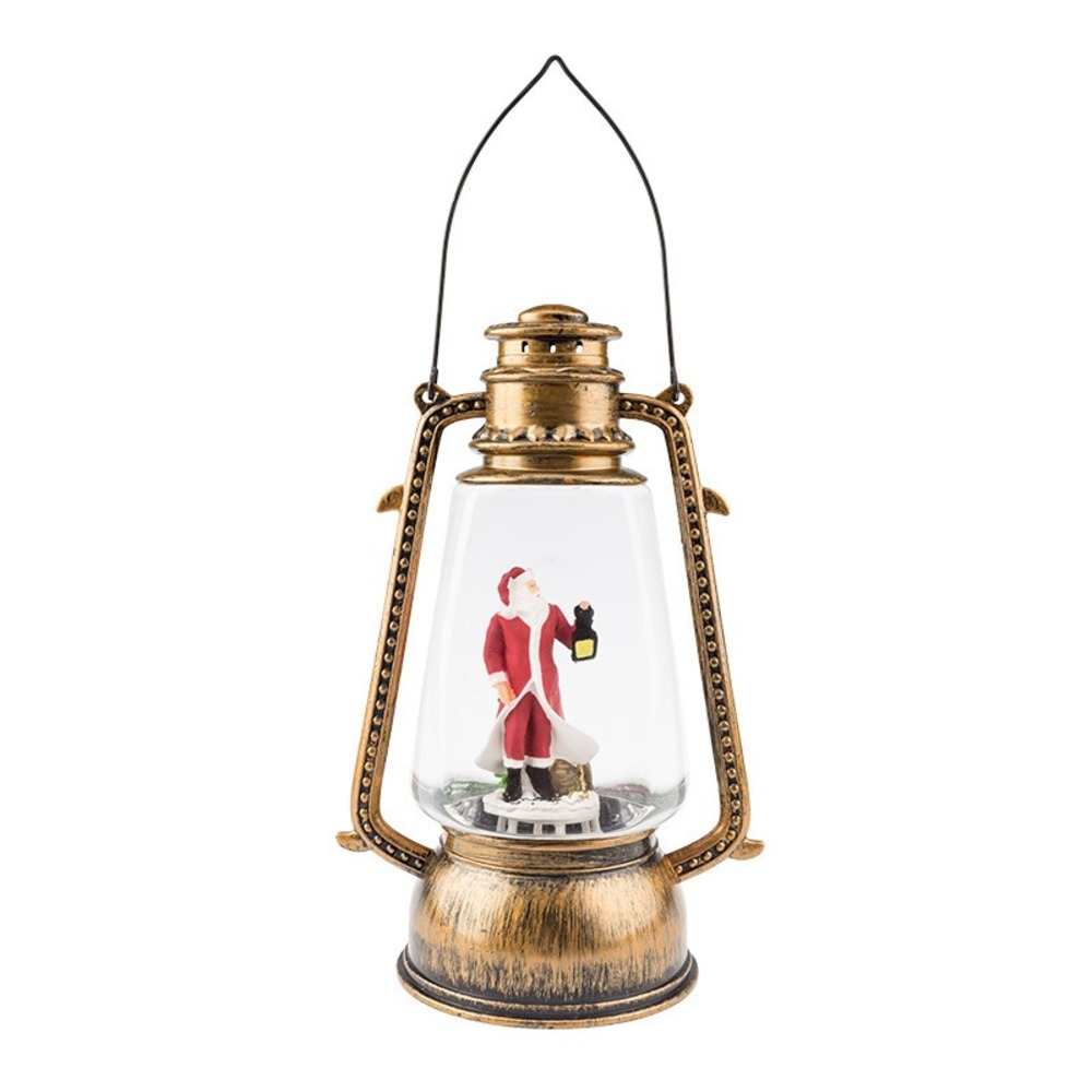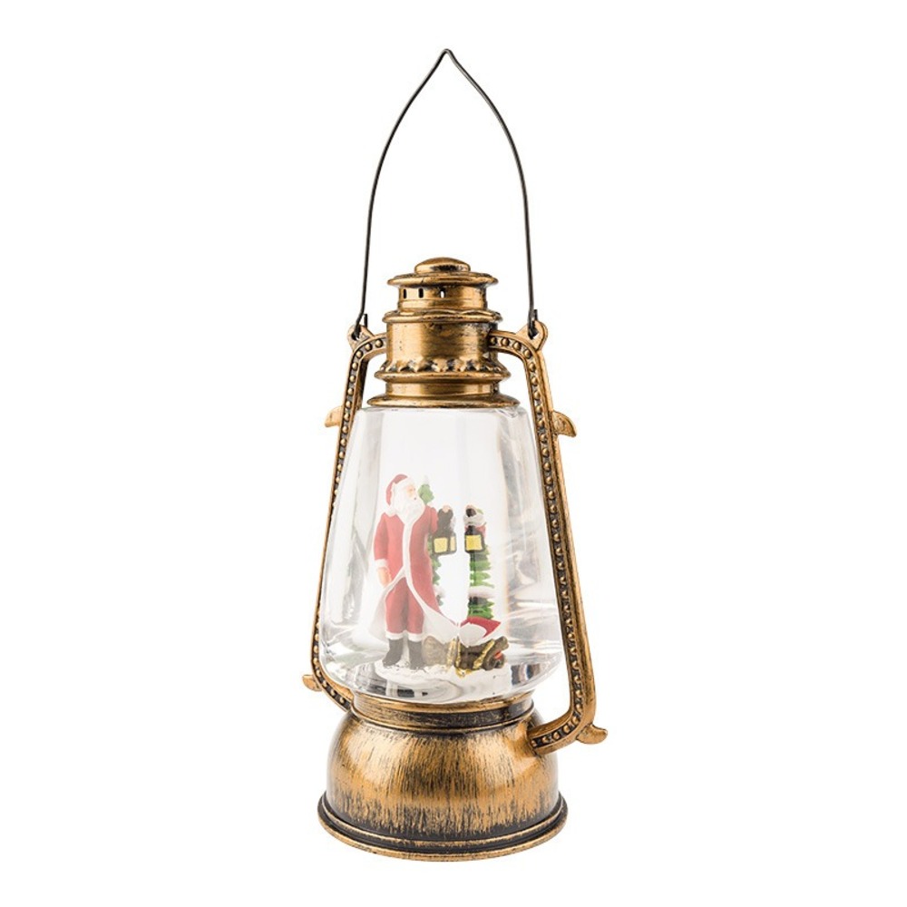 Декоративный фонарь с эффектом снегопада и подсветкой «Санта Клаус» — прекрасное решение для создания праздничной атмосферы в доме, которое поможет почувствовать уют и окунуться в настоящую зимнюю сказку. Светильник с диодами, излучающими теплый белый свет, питается от 4 батареек типа ААА и является абсолютно безопасным в использовании. Можно подключить изделие к ноутбуку через USB-кабель или к сети при помощи адаптера. Высота корпуса — 25 см. В прозрачной колбе находится яркая фигурка Санта Клауса, вокруг которой искрится вихрь золотистых блесток. Корпус фонаря выполнен в бронзовом цвете с эффектом старения поверхности.