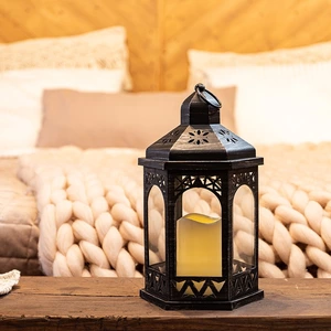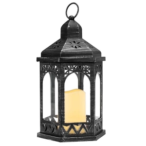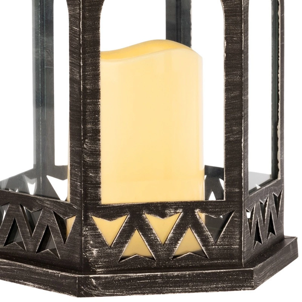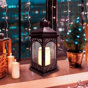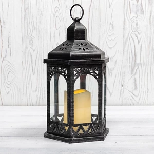 Декоративный фонарь со свечкой в корпусе черного цвета — стильное интерьерное украшение, которое создает уют и ощущение тепла в долгие зимние вечера. Резные элементы, обрамляющие стекла, усиливают эффект аутентичности: изделие напоминает старинный подвесной фонарь, а пластиковая свечка со светодиодом имитирует ровное желтое пламя. Изделие питается от 3 батареек типа ААА и предназначено для использования в сухих отапливаемых помещениях. На корпусе есть кнопка ON/OFF для включения и выключения подсветки.