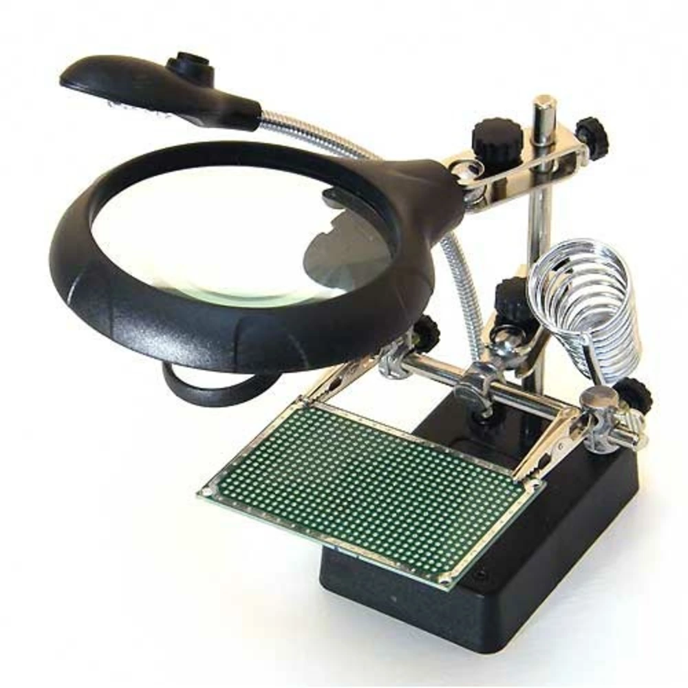 Держатель «третья рука» с лупой х2.5 + х7.5, подставка под паяльник, LED подсветка служит главным образом при проведении паяльно-сборочных работ в электронике, ювелирном деле, сборке и ремонте для зажима мелких деталей в любом нужном положении, когда не хватает двух рук.