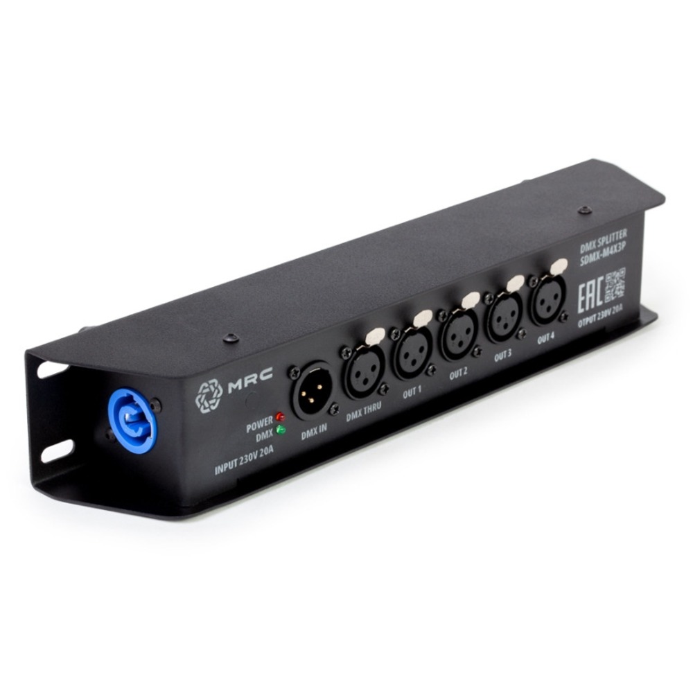 DMX- сплиттер. Вход: 1х XLR3 M; выход: 4х XLR3 F, 1х XLR3 F (проходной); проходной панельный разъем MRC PowerCon 20A/250В (MRC RPWDN-B); гальваническая развязка и усилитель сигнала на каждом канале; индикация: включение в сеть, наличие DMX сигнала на входном и выходных каналах; питание от сети 90-280В через панельный разъем MRC PowerCon 20A/250В (MRC RPWDN-A), возможность каскадного подключения (кабель в комплекте не идет)