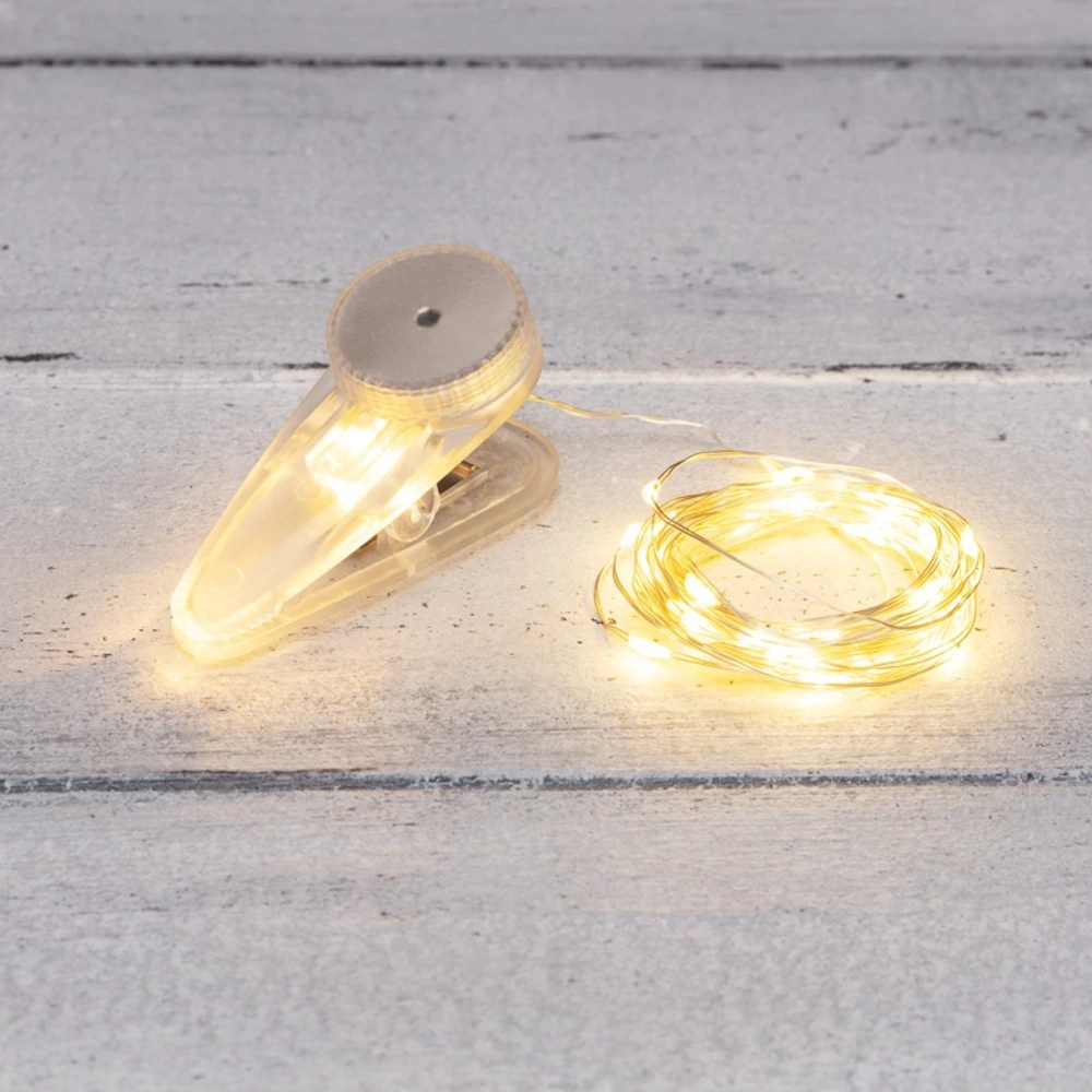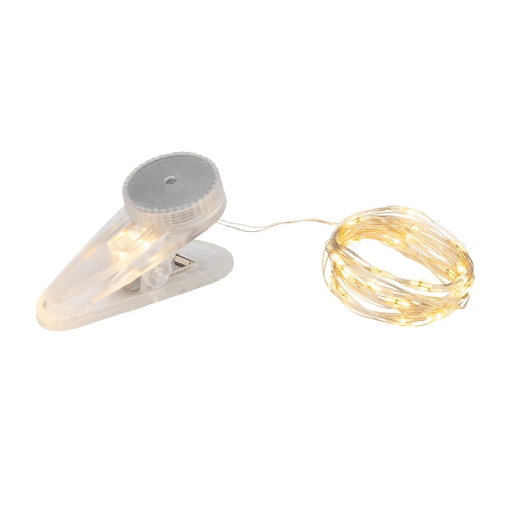 Светодиодная гирлянда «Роса» с прищепкой – прекрасный декоративный элемент, светящийся теплыми белыми огоньками и создающий атмосферу праздника и уюта. Это отличный способ акцентировать внимание на отдельных предметах интерьера, создать неповторимый арт-объект или использовать в качестве дополнительной подсветки. Гирлянда может эффектно подчеркнуть красоту картины, вазы с цветами, статуэтки или украсить небольшую елочку. Часто «Роса» украшает не только интерьер, но и с успехом применяется на торговых площадках и ярмарках для привлечения внимания к продукции. Гирлянда состоит из тонкого провода длиной 3 метра, с расположенными на нем 30 теплыми белыми долговечными светодиодами. В качестве питания у данной модели гирлянды выступают батарейки 2хСR2032, которые идут в комплекте. Создайте атмосферу праздника с помощью светодиодной гирлянды «Роса»!