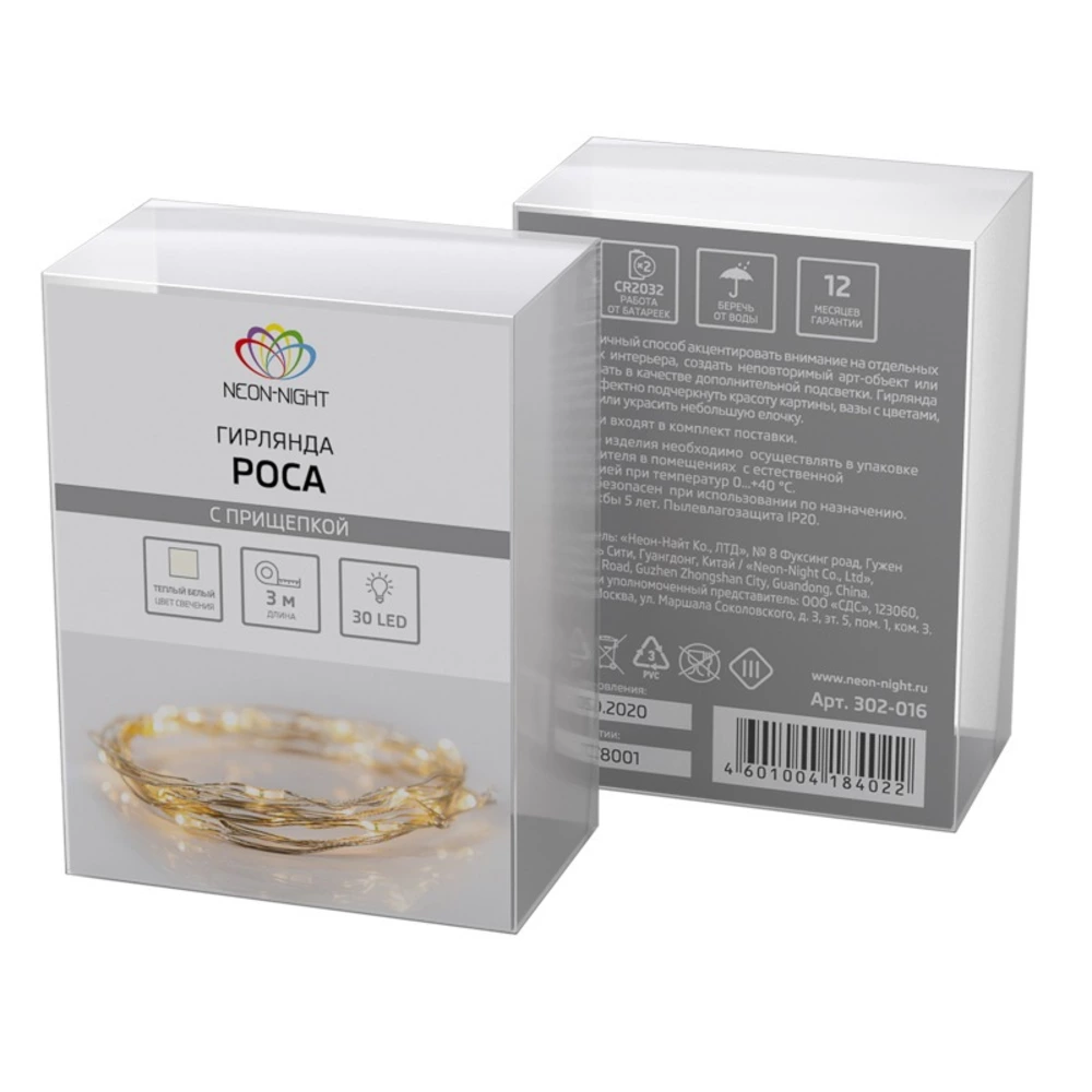 Гирлянда «Роса» Neon-Night 302-016 с прищепкой 3 м, 30 LED, теплое белое свечение, 2хCR2032 в комплекте