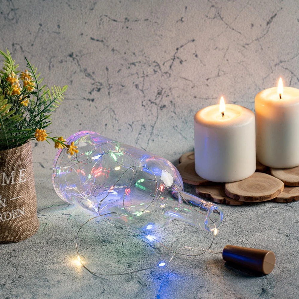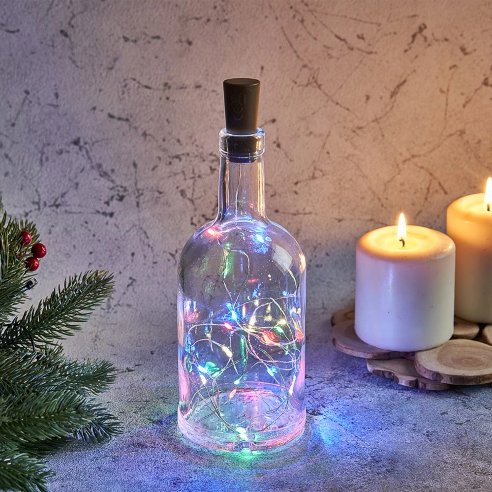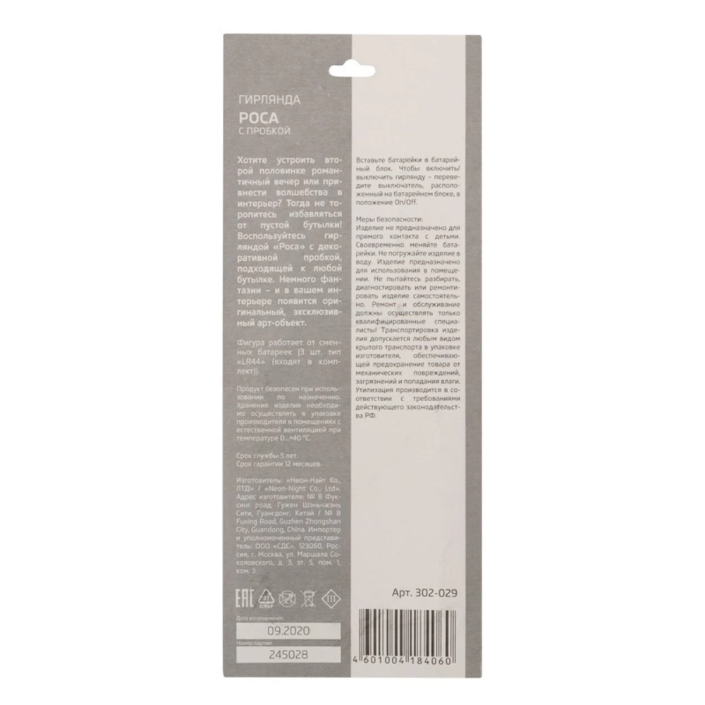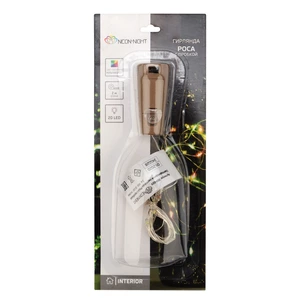 Хотите устроить второй половинке романтичный вечер или привнести волшебства в интерьер? Тогда не торопитесь избавляться от пустой бутылки! Воспользуйтесь гирляндой «Роса» с декоративной пробкой, подходящей к любой бутылке. Немного фантазии - и в вашем интерьере появится оригинальный, эксклюзивный арт-объект. Такой аксессуар можно использовать в качестве ночника, декоративного элемента в интерьере или в составе необычной композиции. Гирлянда состоит из тонкого провода длиной 2 метра, с расположенными на нем 20 разноцветными долговечными светодиодами. В качестве питания у данной модели гирлянды выступают батарейки 3хLR44, которые идут в комплекте.