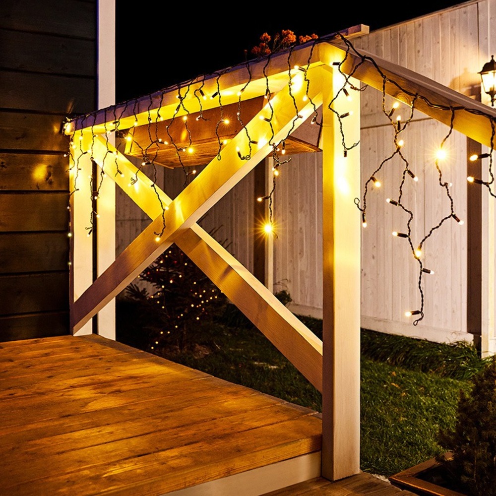 Гирлянда "Бахрома" ("Айсикл") представляет собой гибкий горизонтальный шнур-шину, к которому через определенные промежутки крепятся вертикальные нити разной длины со светодиодами. Она имитирует сосульки и может послужить эффектным и оригинальным решением при декорировании карнизов домов, арок, фасадов зданий, витрин магазинов, а также стать элементов декора внутренних интерьеров помещений. Благодаря использованюя в гирлянде светодиодов, ее отличительной особенностью является превосходная яркость и низкое энергопотрбление по сравнению с лампами накаливания. При длине 2,4 метра гибкая направляющая имеет 24 вертикальные нити от 20 до 60 см. Данная гирлянда имеет Теплый белый цвет свечения и предназначена для использования как внутри помещения, так и снаружи.