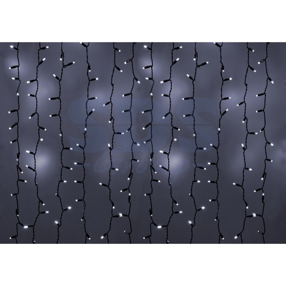 Гирлянда Светодиодный Дождь 2х3м эффект мерцания черный провод 220В диоды БЕЛЫЕ 235-201 представляет собой гибкий горизонтальный шнур-шину (2м), к которому через определенные промежутки крепятся вертикальные нити (20 шт.) со светодиодными лампами, которые отличаются от «Бахромы» тем, что имеют одинаковую, достаточно значительную длину, часто превышающую протяженность шины. На концах каждой шины есть разъем и штепсель, которые предназначены для последовательного соединения нескольких световых дождей в большой занавес ПЛЕЙ-ЛАЙТ. Используя занавес, можно не только создавать красивые световые занавесы или оформлять различные плоскости, например, фасады домов, окна и т.д., но и украшать объемные объекты. Гирлянду, работающую в непрерывном свечении, называют фиксинг, а использующую режим светодинамики – чейзинг. Режим чейзинг имеет различные светодинамические эффекты. Данная гирлянда имеет эффект мерцания. Сегодня в гирляндах источником света служат светодиоды, которые пришли на смену применявшимся ранее лампам накаливания. С полупроводниковыми источниками гирлянда стала более надежной, потребляет меньше энергии, обрела более насыщенное сияние.