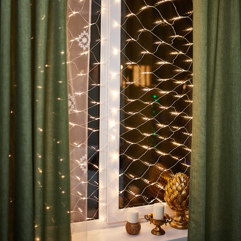 Гирлянда «Сеть» 1,8×1,5 м с защитой IP20 предназначена для использования в квартире, доме, офисе и других отапливаемых помещениях с нормальной влажностью. Гирлянда представляет собой воздушное полотно с крупными ячейками, выполненное из провода с прозрачной ПВХ-изоляцией. 180 экономичных светодиодов излучают яркий белый свет теплого оттенка. Для установки изделия удобно использовать присоски с крючками. Для подключения к электросети предусмотрен трехметровый кабель. Светодинамические эффекты переключаются при помощи контроллера — всего 8 режимов.