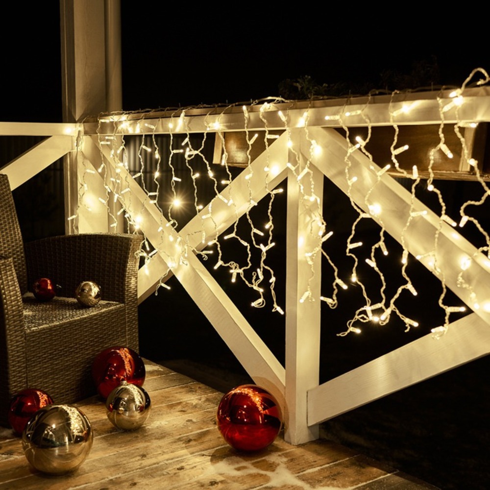 Гирлянда светодиодная «Дождь» («Занавес») представляет собой гибкий горизонтальный шнур-шину (2 м), к которому через определенные промежутки крепятся вертикальные нити (20 шт.) равной длины (0,8 м) со светодиодами. Данная гирлянда предназначена для использования как внутри помещений, так и снаружи. Идеально подойдет для украшения кафе, торговых центров, офисов и т. д. Благодаря коннекторам на концах гирлянды, можно соединять несколько гирлянд в один большой занавес, закрывая обширные площади. Данная гирлянда имеет 160 светодиодов с теплым белым цветом свечения.