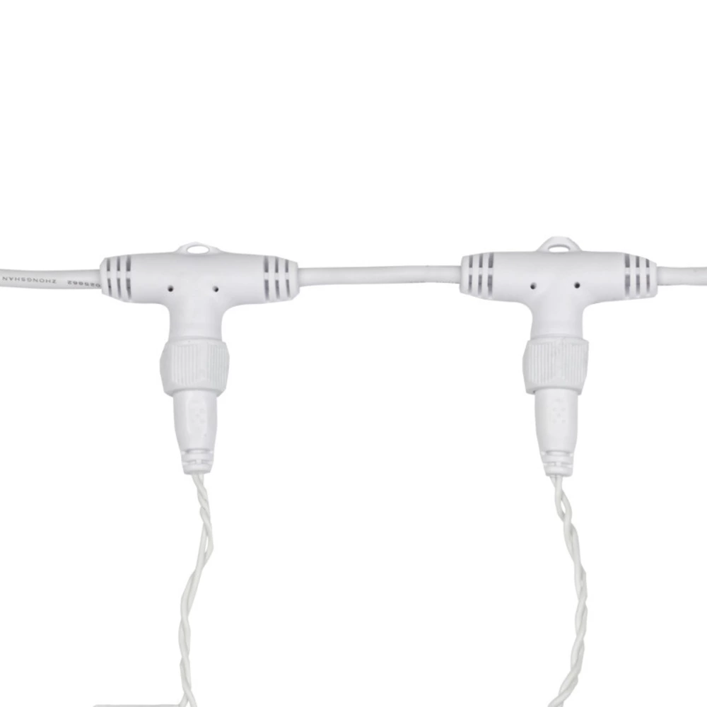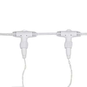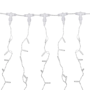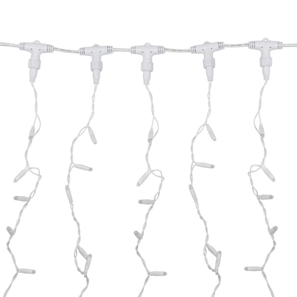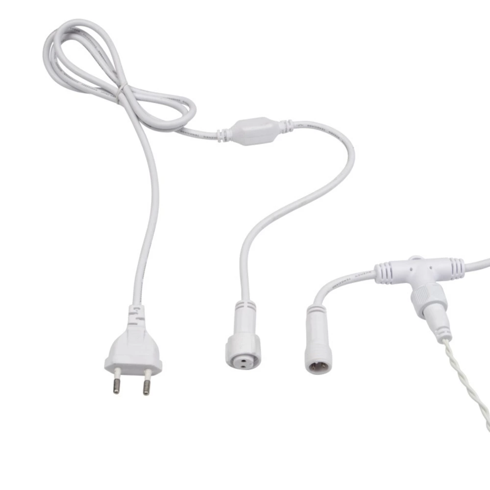 Гирлянда светодиодная «Дождь» представляет собой гибкий горизонтальный шнур-шину (2 м), к которому через определенные промежутки крепятся вертикальные нити (20 шт.) со светодиодными лампами, которые отличаются от «Бахромы» тем, что имеют одинаковую, достаточно значительную длину, часто превышающую протяженность шины. На концах каждой шины есть разъем и штепсель, которые предназначены для последовательного соединения нескольких световых «Дождей» в большой занавес «Плей-Лайт». Используя занавес, можно не только создавать красивые световые занавесы или оформлять различные плоскости, например, фасады домов, окна и т. д., но и украшать объемные объекты. Гирлянду, работающую в непрерывном свечении, называют фиксинг, а использующую режим светодинамики – чейзинг. Режим чейзинг имеет различные светодинамические эффекты. Данная гирлянда имеет эффект мерцания. Сегодня в гирляндах источником света служат светодиоды, которые пришли на смену применявшимся ранее лампам накаливания. С полупроводниковыми источниками гирлянда стала более надежной, потребляет меньше энергии, обрела более насыщенное сияние. Данная гирлянда имеет теплый белый цвет свечения светодиодов.