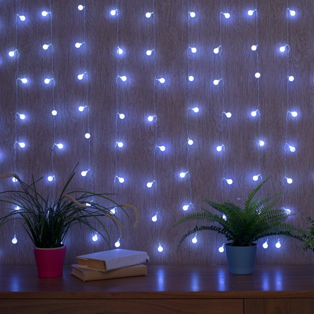 Гирлянда «Дождь» 1,5×1,5 м с матовыми насадками-шариками диаметром 18 мм выполнена в виде занавеса, который отлично подходит для декора оконных проемов внутри помещений. Гирлянда со 144 светодиодами излучает белый свет и создает уютную атмосферу теплых домашних вечеров в кругу семьи. Контроллер с 8 режимами позволяет менять опции по настроению. Конструкция в оболочке из прозрачного ПВХ имеет защиту IP20.