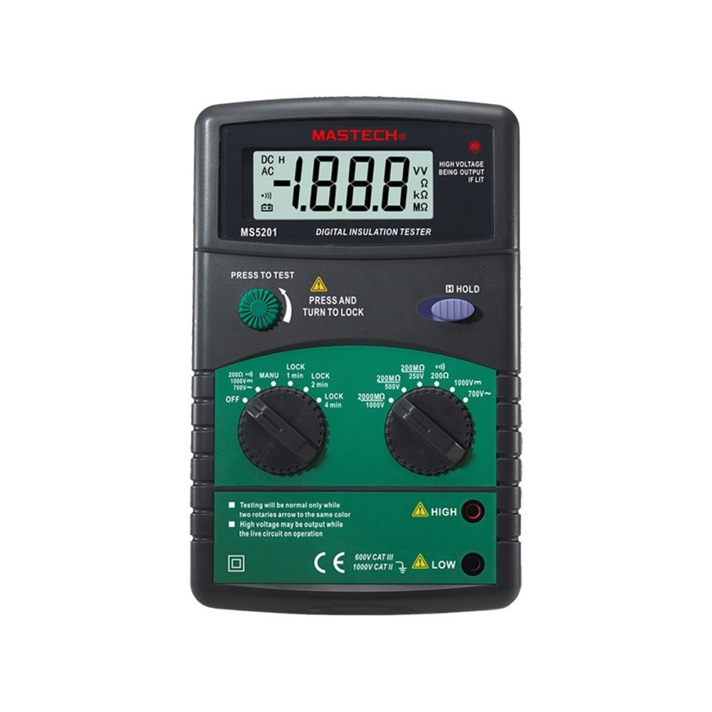 Измеритель сопротивления изоляции или мегаомметр MS5201 MASTECH используется для замера сопротивления изоляции токопроводящих элементов сетей, находящихся под напряжением. Он позволяет измерить напряжение постоянного и переменного тока и сопротивление. Идеально подходит для электротехнических работ и электромонтажных работ на производстве, в строительстве электрических сетей, их контроле и эксплуатации. Цифровой мегомметр MS5201с большим 3,5-разрядным ЖК-дисплеем – это модель начального уровня в линейке мегоомметров MASTECH, но уже оснащен очень хорошо. Кроме замера сопротивления изоляции позволяет измерить напряжение постоянного и переменного тока, а также сопротивление. Полностью соответствует всем стандартам электробезопасности. Имеет звуковую и светодиодную индикацию перегрузки. Осуществляет прозвон целостности электроцепи (зуммер при сопротивлении <50 Ω). Функция удержания данных замера. Поставляется в картонной коробке в комплекте с соединительными проводами, зажимами, отверткой, мягкой сумкой-чехлом, пластиковым кейсом и батарейками. Характеристики: Напряжение переменного тока: 700 В (±1.2% ±5) Напряжение постоянного тока: 1000 В (±0.8% ±3) Сопротивление: 200 Ω (±1.0% ±3) Сопротивление изоляции: - 200 МΩ/250 В (±3,0% ±5) - 200 МΩ/500 В (±3,0% ±5) - 50~1000 МΩ/1000 В (±3,0% ±5) - 1000~2000 МΩ/1000 В (±5,0% ±5) Выходной ток короткого замыкания: ≤2.5 mA Питание: 6 х 1,5 В батарейки АА Защита от перегрузки: CAT II 1000 В / CAT III 600 В Размеры: 192x122x55 мм Вес: 545 г