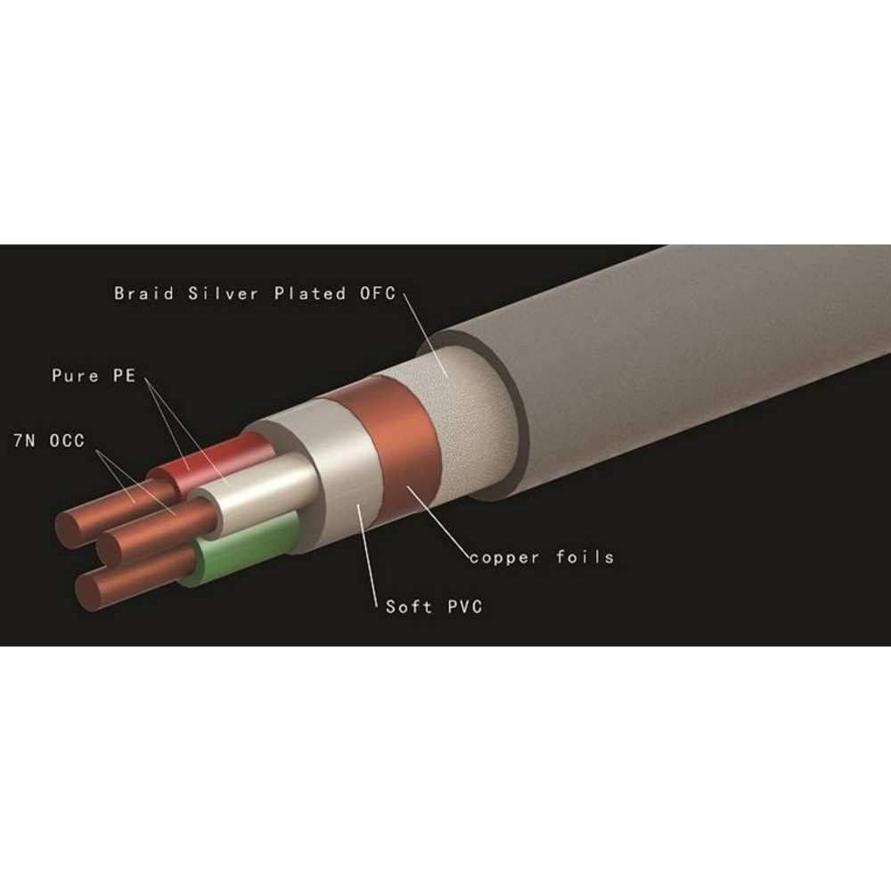Два экранирующих слоя изготовлены из толстой медной фольги и медной проволоки OFC диаметром 0,1 мм, вплетенной в изоляционную сетку, что позволяет достичь высочайшего стандарта экранирующего эффекта.