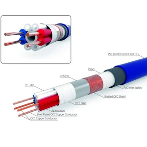 | Конструкция | Проводники размещаются в кабеле с помощью полиэтиленовых воздуховодов, которые обматываются тефлоновой лентой + майларовая фольга + медная OFC оплетка + бумажная лента + черный внутренний ПВХ и в заключении внешняя оболочка из ПВХ синего цвета |