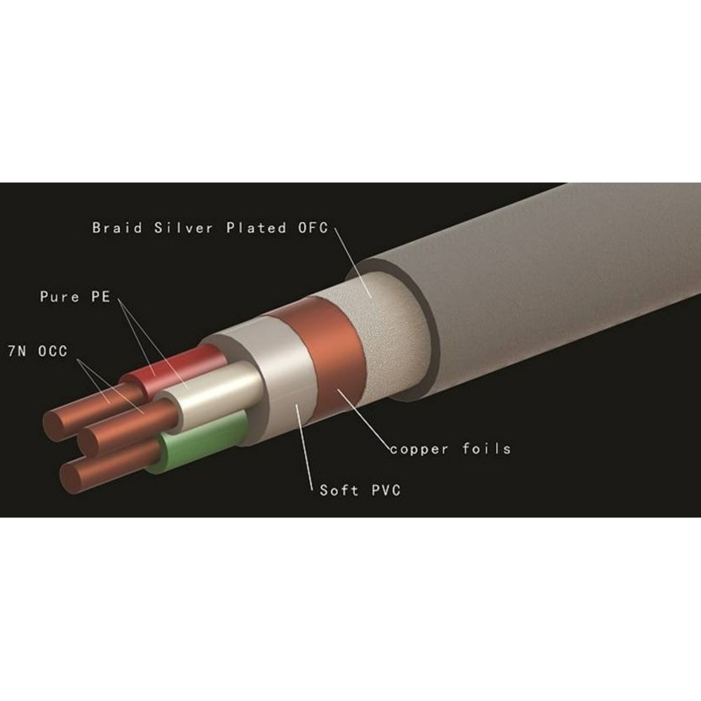 Два экранирующих слоя изготовлены из толстой медной фольги и медной проволоки OFC диаметром 0,1 мм, вплетенной в изоляционную сетку, что позволяет достичь высочайшего стандарта экранирующего эффекта.