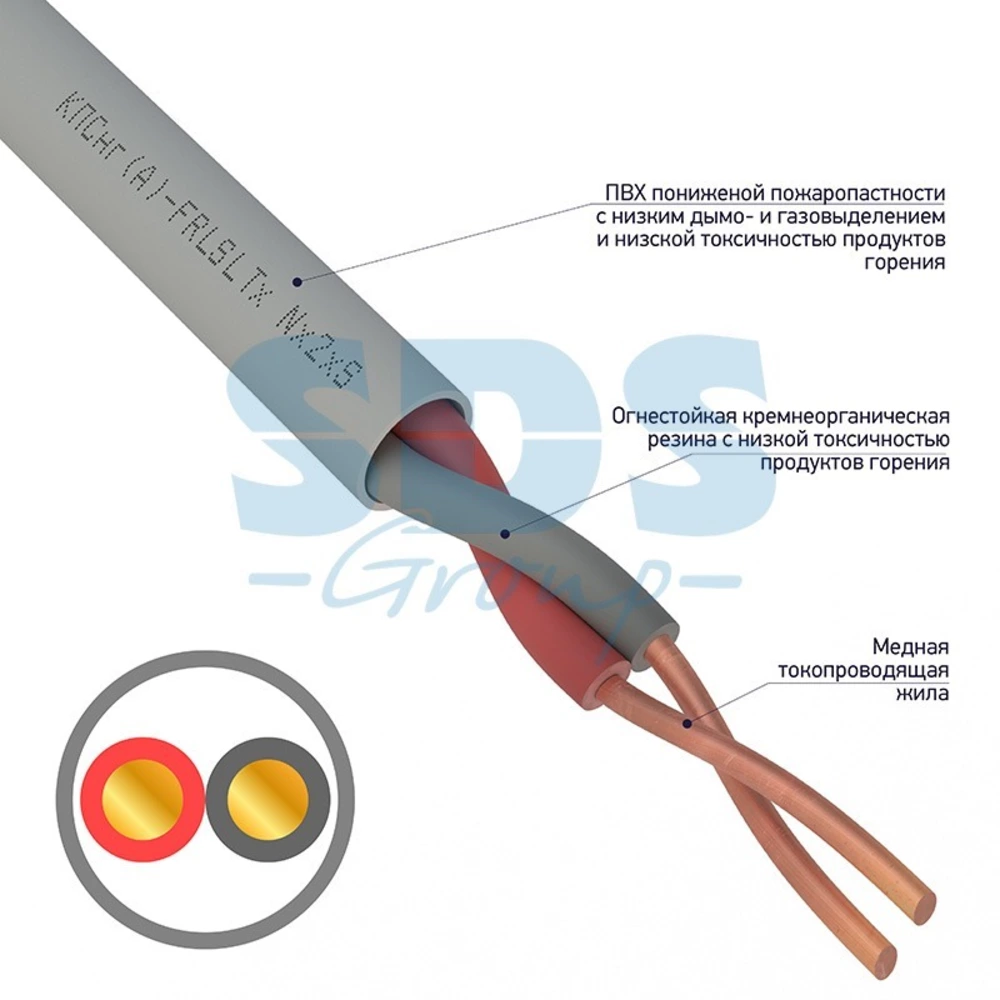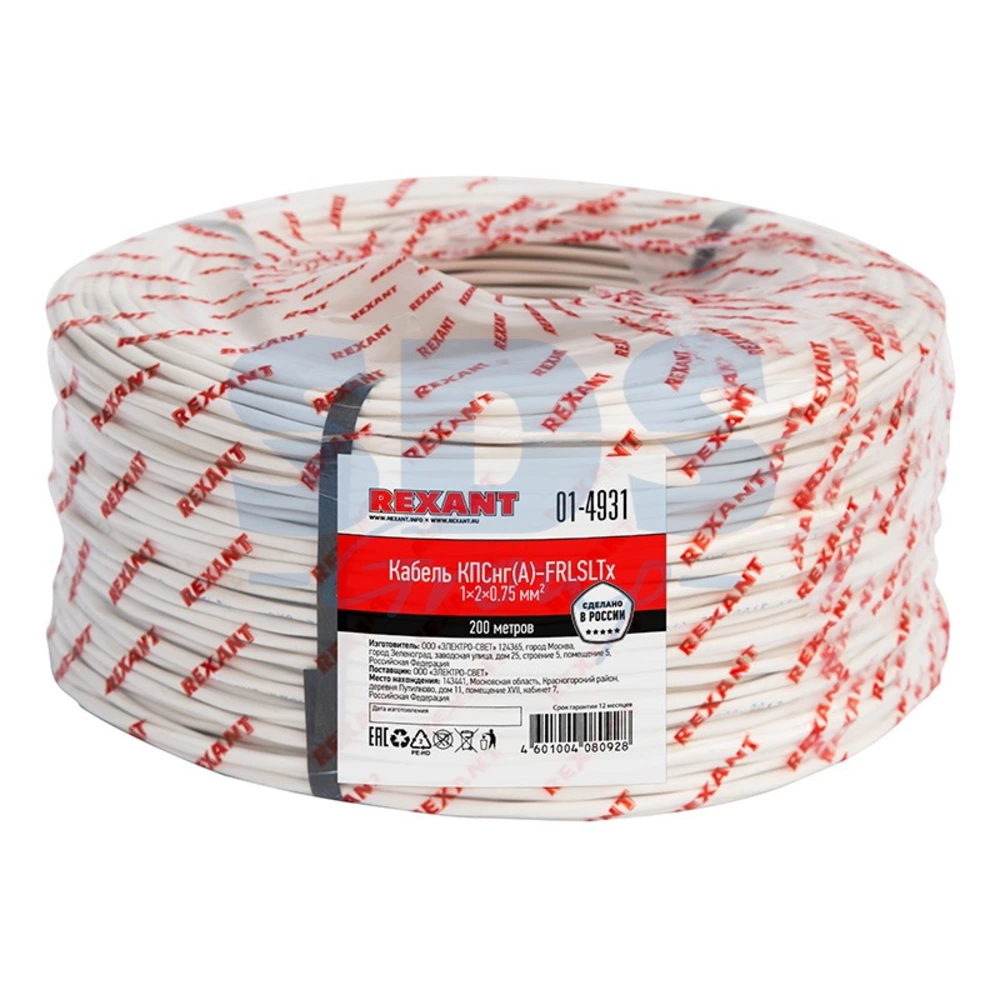 Кабель КПСнг(А)-FRLSLTx 1x2x0,75 мм² REXANT симметричной парной скрутки, огнестойкий, безгалогенный, не распространяющий горение при групповой прокладке и не выделяющий коррозионно-активных газообразных продуктов при горении и тлении, низкий уровень токсичности.