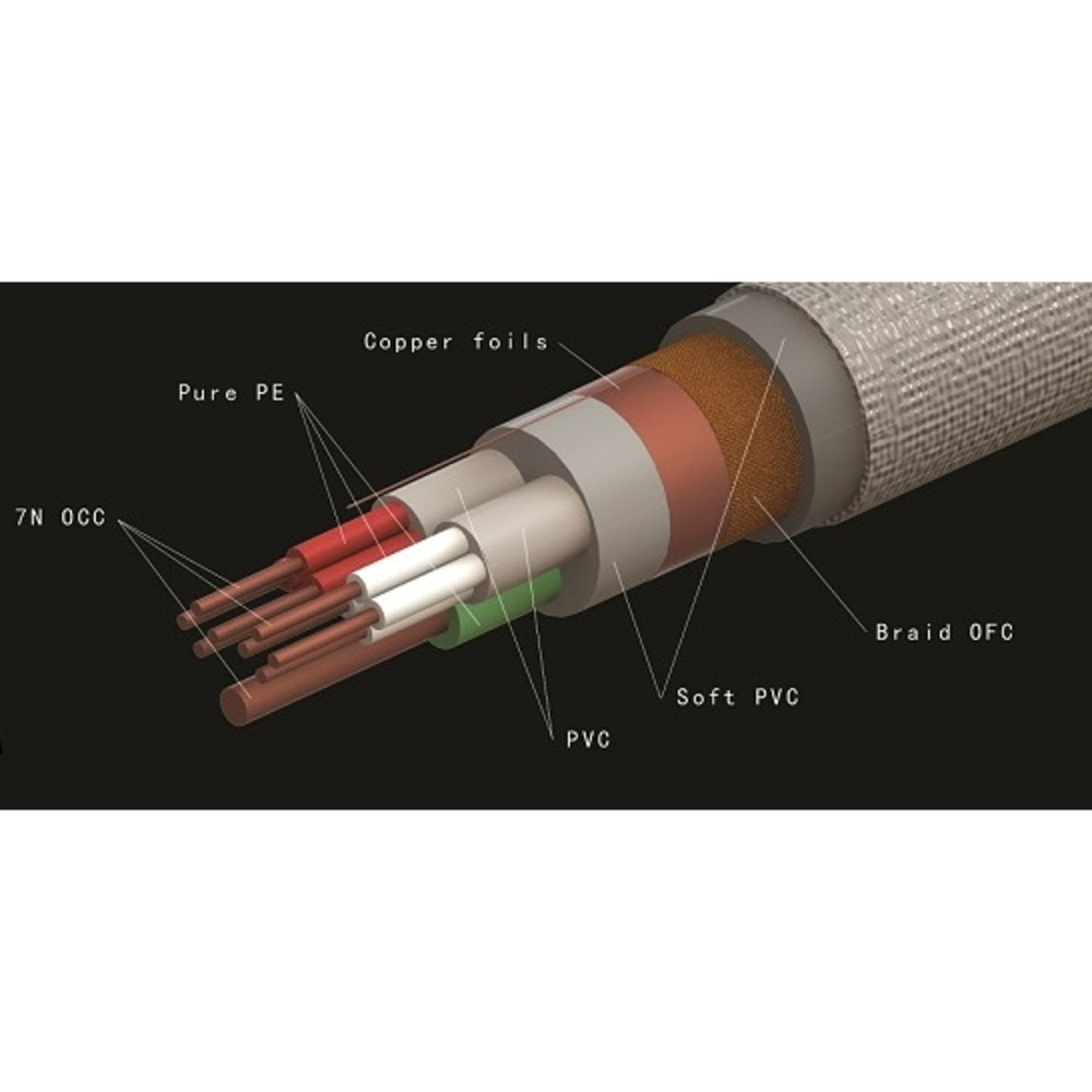Токопроводящие проводники (“горячий” и “холодный”) имеют 4 независимых структуры сердечника, каждая из которых состоит из 2-х – плетеных жил диаметром 0,2 мм OCC и 2-х плетеных жил диаметром 0,1 мм каждая, изготовленных из сверхчистой монокристаллической меди 7N OCC. Кроме того, внутри проведен скрученный проводник заземления, выполненный из скрученных медных жил 7N OCC диаметром 0,2 мм каждая, плюс два экранирующих слоя соответственно состоят из толстой медной фольги и плетеной изоляционной сетки из медной проволоки диаметром 0,1 мм. Диаметр токопроводящих жил (горячей и холодной) составляют 3,85 кв. мм, а заземляющего провода – 4,0 кв. мм. Так как сопротивление проводников очень мало, ток может быть доставляется на оборудование очень быстро, а большая площадь поперечного сечения заземляющего проводника обеспечивает превосходную стабильность заземления, сводит к минимуму нестабильность точки заземления, вызванную плавающим напряжением.