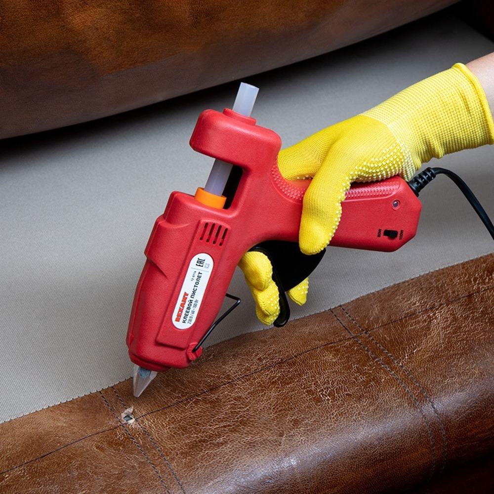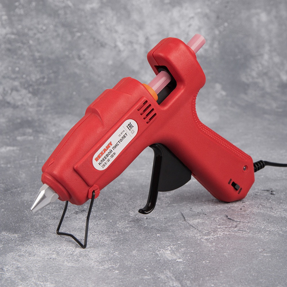Пистолет клеевой 60 Вт-100 Вт (Профи) REXANT предназначен для прочной фиксации поверхностей с помощью расплавленной клеевой массы. Пистолет работает в двух мощностных режимах: 60 Вт и 100 Вт. Заправляется он специальным клеевым стержнем диаметром 11 мм. Корпус клеевого пистолета изготовлен из ударопрочной пластмассы и имеет скобу для надежной установки в нерабочем положении. Благодаря индикации на корпусе пистолета (LED лампочки красного и зеленого цветов) удобно определить включен ли пистолет и когда будет достигнута оптимальная для работы температура. Принцип работы: клеевой стержень плавится в металлической камере с помощью нагревательного устройства и для точного дозирования при нажатии на курок подается из сопла на склеиваемую поверхность. Высокая мощность пистолета позволяет очень быстро разогреть клеевой стержень и получать удовольствие от быстрой и бесперебойной работы. С его помощью вы сможете склеить: дерево, пластик, резину, кожу, стекло, металлы (их лучше перед работой разогревать феном), ткань, пенопласт, керамику, картон, бумагу, цветы или что-то другое. Используется как в домашних условиях, так и на производстве: для монтажа электрических плат, декорирования, изготовления упаковочной и сувенирной продукции, при прокладке кабеля сетей фиксированной телефонной связи и сетей передачи данных, при производстве багетов и картинных рам. Основные характеристики: Напряжение питания: 230 В Потребляемая мощность: 60 Вт/100 Вт Диаметр применяемых стержней: 11мм Производительность прибора: 15-18 г/мин Время непрерывной работы: 60 мин Время прогрева: 5-7 мин Защита от проивольного протекания клея: есть Длина провода: 1,35 м Для возможности хорошо ознакомиться с товаром не вынимая его из упаковки, безопасного хранения и бережной транспортировки предусмотрена блистерная упаковка.