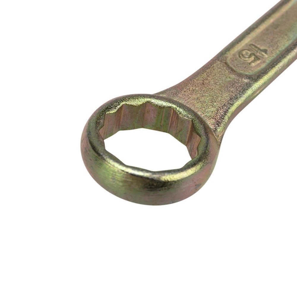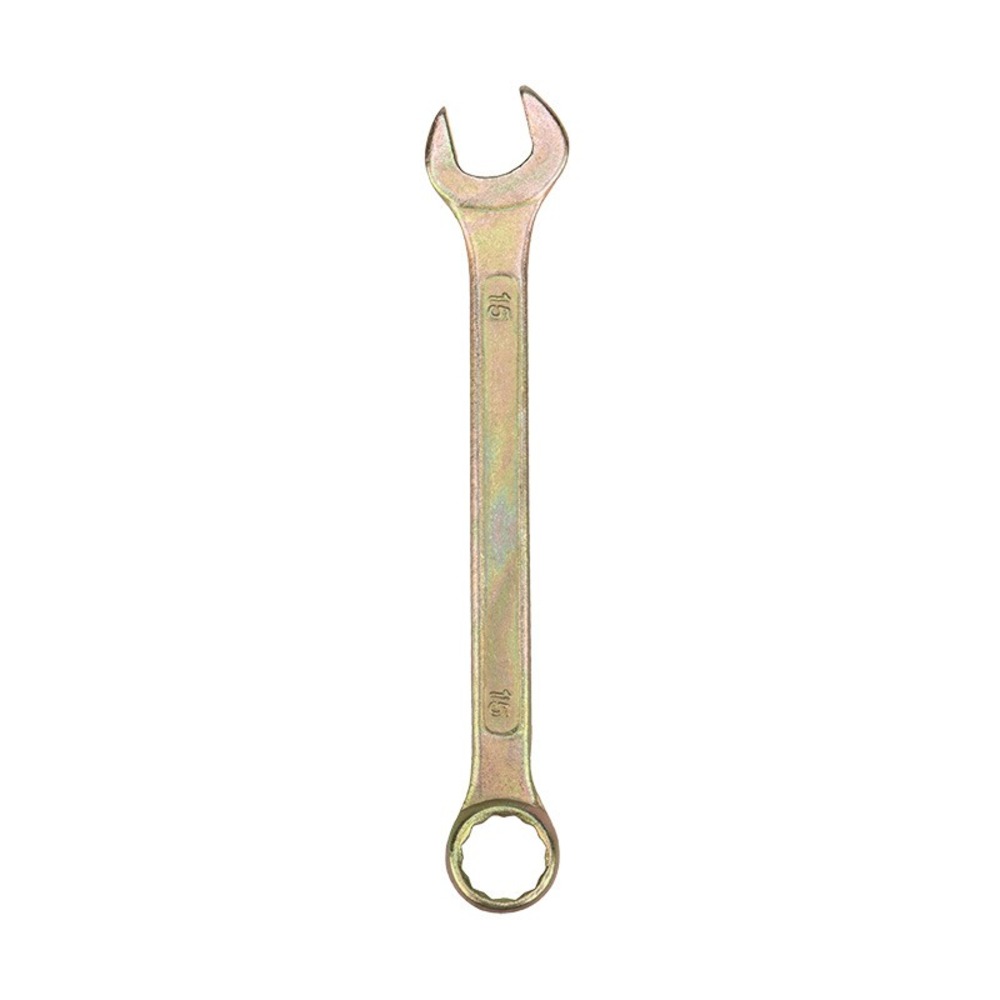 Комбинированный гаечный ключ предназначен для монтажа и демонтажа резьбовых соединений: болтов и гаек. Инструмент применяется в бытовых условиях, в слесарных мастерских и на производстве. Желтое оцинкованное покрытие препятствует появлению коррозии и продлевает срок службы инструмента. Технические характеристики: Твердость материала рабочей части ключа: 44-48 HRC Размер: 15 мм