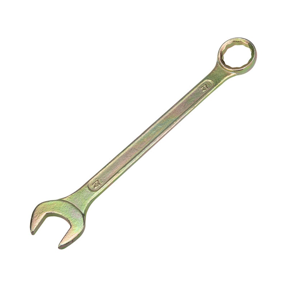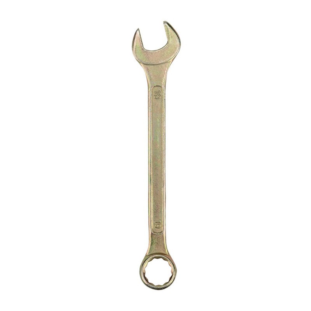 Комбинированный гаечный ключ предназначен для монтажа и демонтажа резьбовых соединений: болтов и гаек. Инструмент применяется в бытовых условиях, в слесарных мастерских и на производстве. Желтое оцинкованное покрытие препятствует появлению коррозии и продлевает срок службы инструмента. Технические характеристики: Твердость материала рабочей части ключа: 44-48 HRC Размер: 19 мм