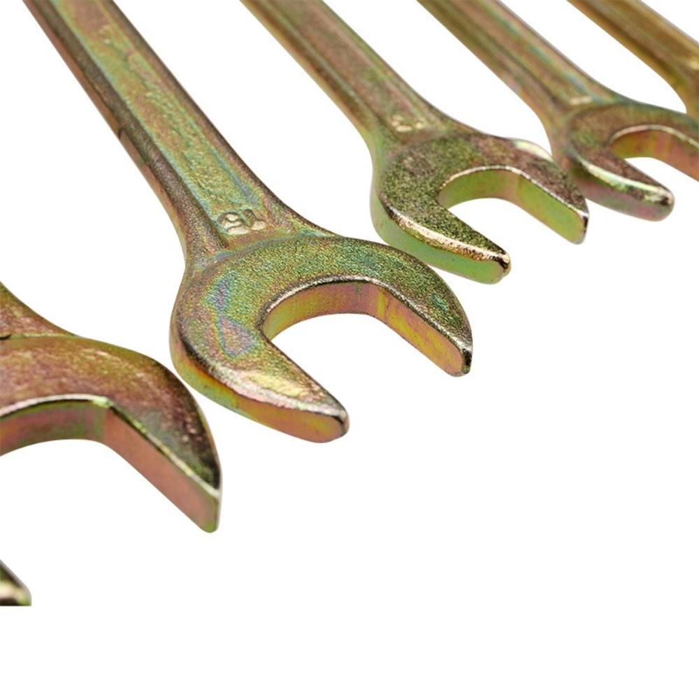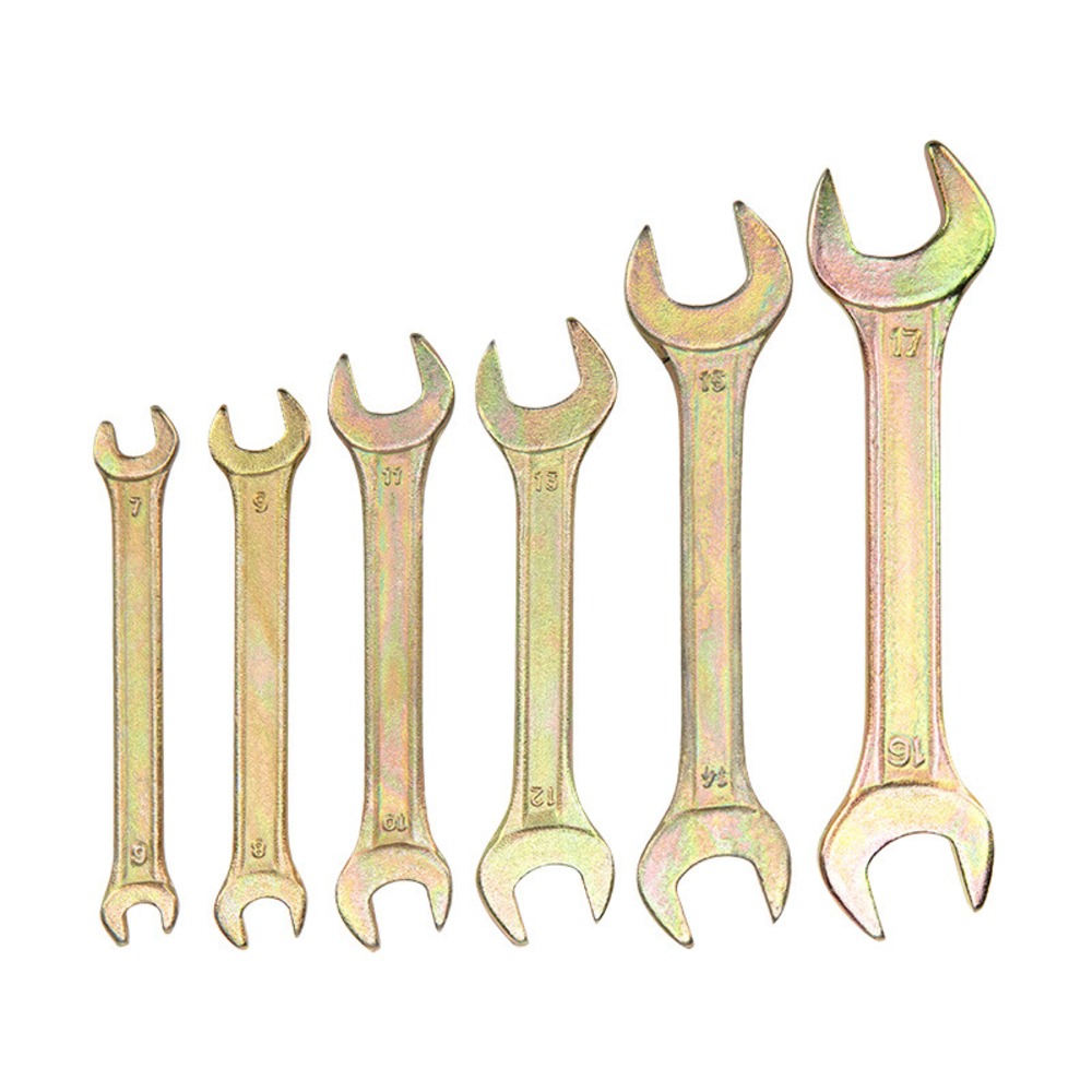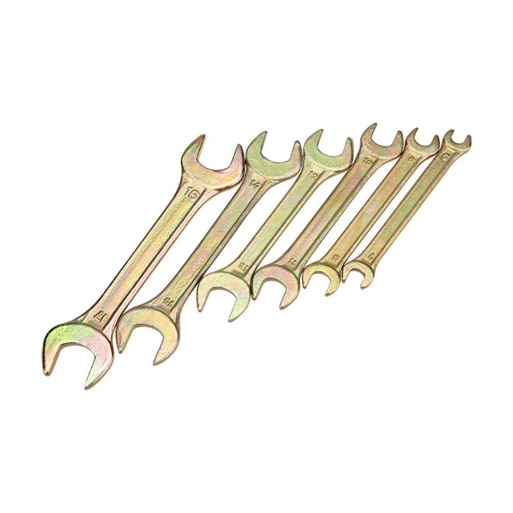 Набор рожковых гаечных ключей предназначен для монтажа и демонтажа резьбовых соединений. Желтое оцинкованное покрытие препятствует появлению коррозии и продлевает срок службы инструмента. Технические характеристики: Твердость материала рабочей части ключа: 44-48 HRC Размеры инструментов: 6×7, 8×9, 10×11, 12×13, 14×15, 16×17 мм