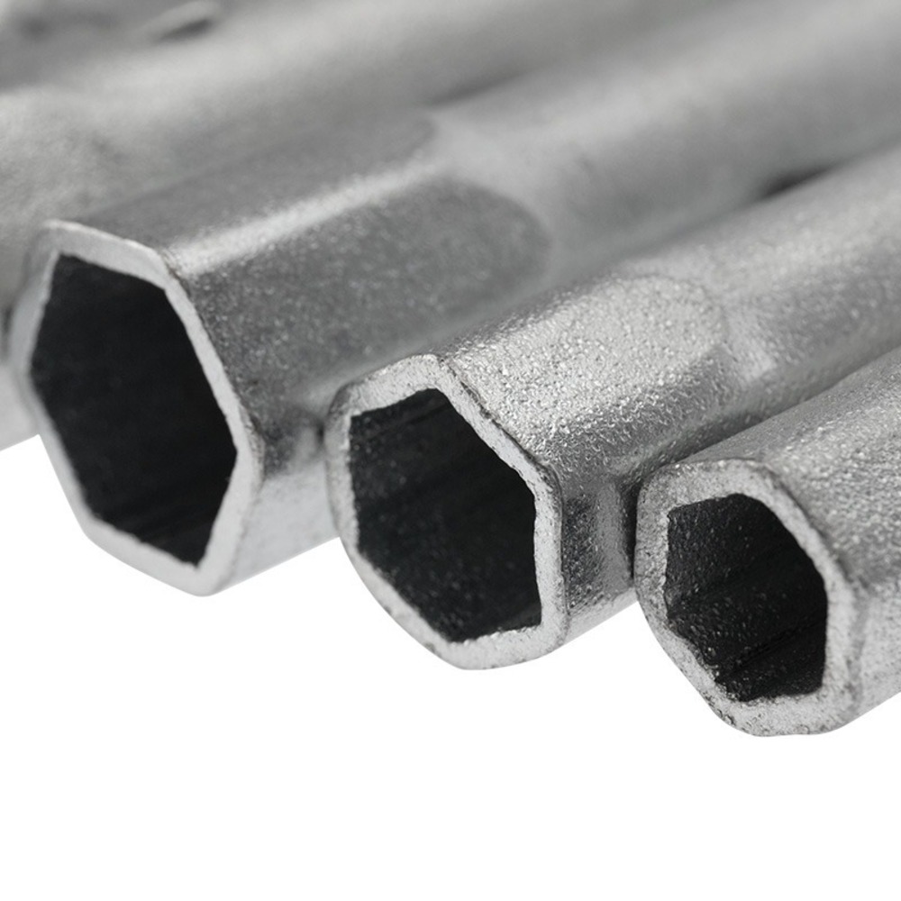 Набор ключей-трубок торцевых предназначен для монтажа и демонтажа болтовых соединений в труднодоступных местах. С обеих сторон расположен захват разных размеров. Кольцевой захват имеет 6 граней, благодаря чему улучшается сцепление с крепежом и уменьшается риск повреждения граней крепежа. Для удобства использования поставляются с воротком. Инструмент изготовлен из углеродистой стали 45. Твердость материала рабочей части ключа 41 HRC. Технические характеристики: Набор ключей-трубок торцевых: 6 предметов Размеры ключей: 6х8, 10х11, 12х13, 14х15, 16х17 мм + вороток Набор упакован в блистер.
