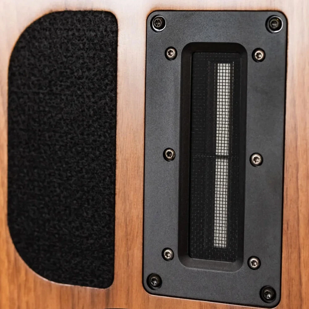 Столь сложная форма удобна с точки зрения расстановки и так же выгодна с точки зрения гашения резонансов и отражений внутри корпуса. Задние стенки акустических систем усилены алюминиевыми панелями, на которых расположены клеммы, кроссовер и крупный порт фазоинвертора.