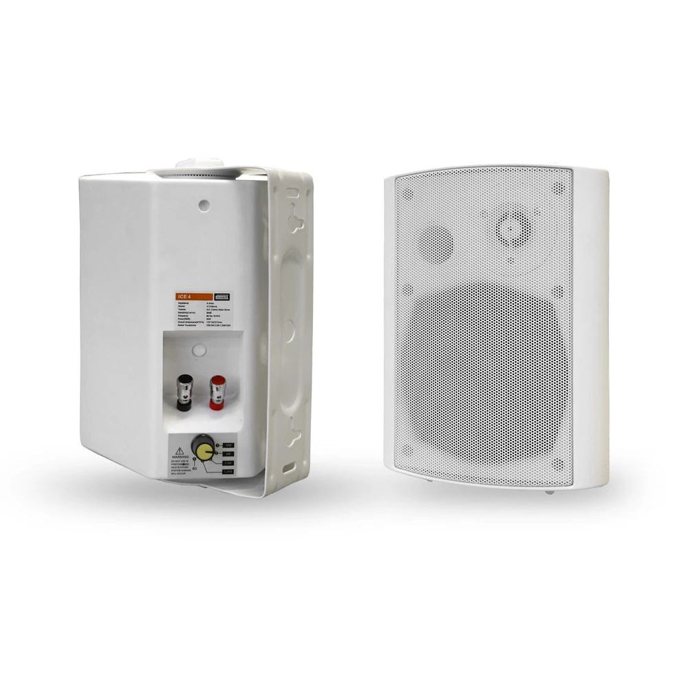 ICE-4 - высококачественная акустическая система из прочного пластика ABS. Предназначена для систем фонового озвучивания помещений, а также для установки на открытом воздухе без прямого попадания влаги. Акустическая система может работать с сопротивлением 8 Ом и в 70/100В линии. ICE - 4 оснащена трансформатором (70В/100В), позволяющим подключать несколько громкоговорителей без угрозы перегрузки усилителя мощности, вызванной падением сопротивления. Пользователю предоставляется 4 настройки выходной мощности (1,25Вт, 2,5Вт, 5Вт, 10Вт), переключаемые при помощи вращательного регулятора, расположенного на задней панели АС. Это обеспечивает удобное регулирование уровня громкости объединенных между собой кабинетов.