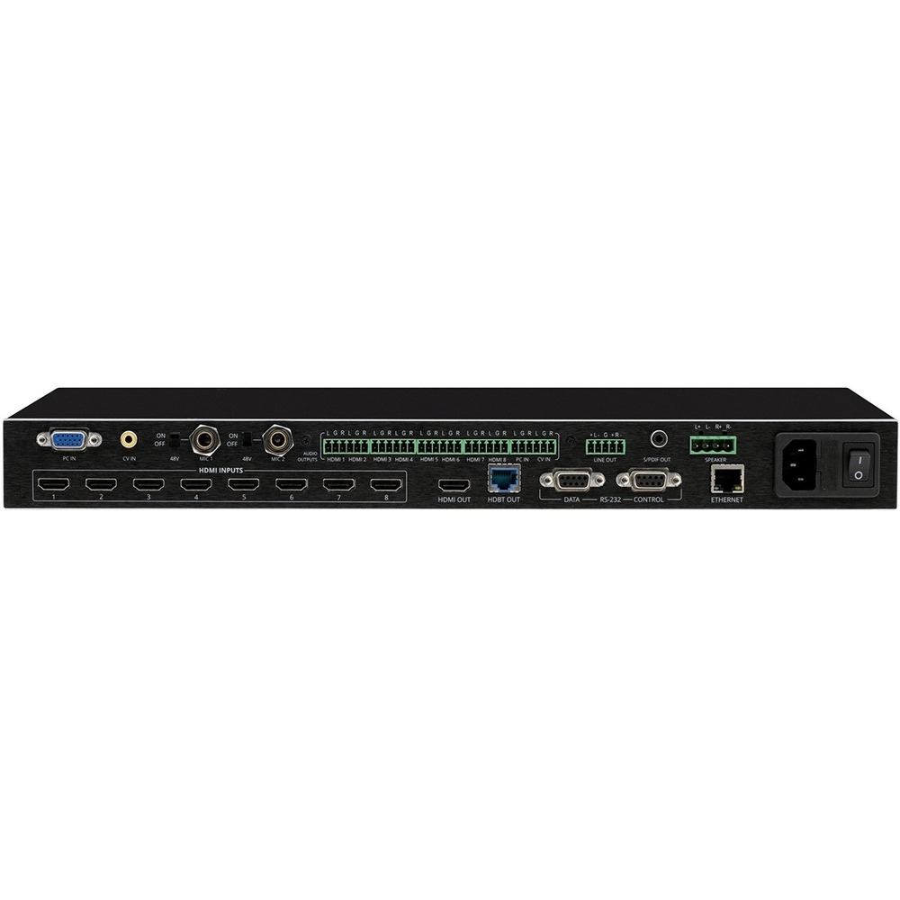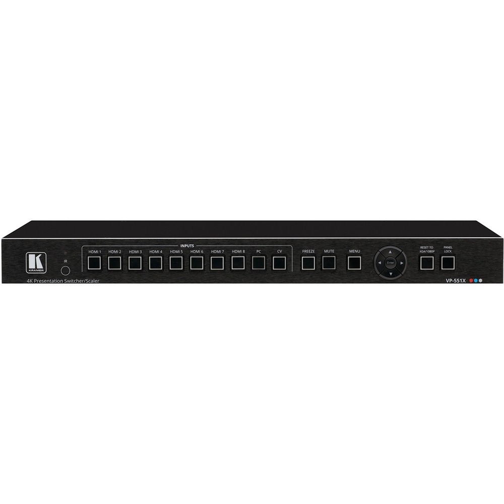 VP-551X – коммутатор, масштабатор сигналов 8хHDMI с HDCP 2.2, VGA, CV в сигналы HDMI и HDBaseT, поддерживаемые разрешения видео до 4K/60 (4:4:4) на входах и выходах. Каждый вход сопряжен со входом аудио, также имеются два дополнительных микрофонных входа с фантомным питанием. Встроенный усилитель мощности 2х20 Вт / 4 Ом. Управление устройством осуществляется по RS-232, ИК и IP (web-интерфейс).