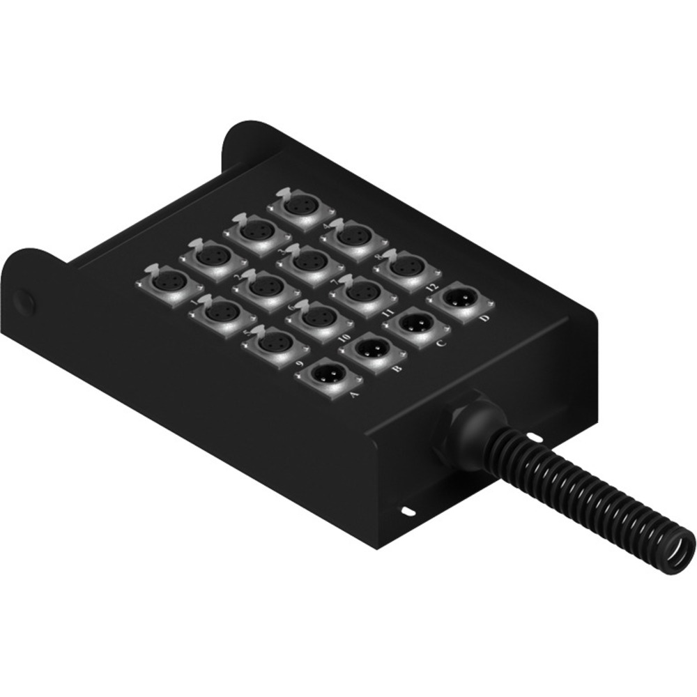 MSB112.4 – коммутационная панель 12х XLR 3 pin (розетка), 4х XLR 3 pin (вилка) без кабеля, серия BASIC. Прочный цельнометаллический блок с установленными разъемами, пригодный для стационарных и мобильных инсталляций. Габаритные размеры: 180 х 85 х 330 мм. Цвет – черный. Коммутационная панель MSB112.4 разработана для профессионального использования в приложениях с высокими требованиями, идеально подходит для одновременной прокладки множества кабелей на концертной площадке или в студии звукозаписи. Разъемы с устройством быстрой фиксации экономят время при прокладке кабельной проводки. Надежная передача сигнала с высокой устойчивостью к шумам и помехам в условиях повышенных внешних электромагнитных полей обеспечивается металлическим корпусом бокса. Панель упакована в чехол и поставляется с полным комплектом разъемов.