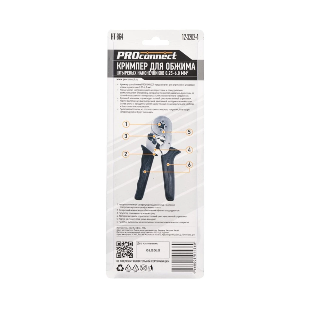 Кримпер PROconnect HT-864 предназначен для обжима штыревых наконечников в диапазоне 0.25-6.0 мм². Особенности: - Корпус выполнен из высокопрочной закаленной инструментальной стали (сплав хрома и ванадия) и имеет закругленные линии корпуса для удобства и безопасного использования. - Четырехсегментная саморегулирующая матрица с системой поворотных кулачков диафрагменного типа. - Клещи имеют настройку давления опрессовки и принудительно размыкающуюся блокировку, которая не позволяет разойтись рукояткам до полной опрессовки, т. е. контролирует качество контактного соединения. - Храповой механизм, гарантирует полный цикл качественной опрессовки. - Рукоятки выполнены из плотного синтетического покрытия с резиновыми вставками, благодаря которому руки не будут скользить.