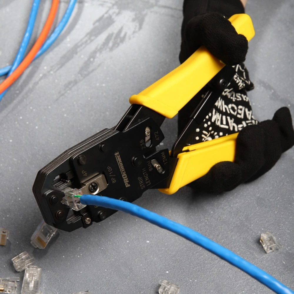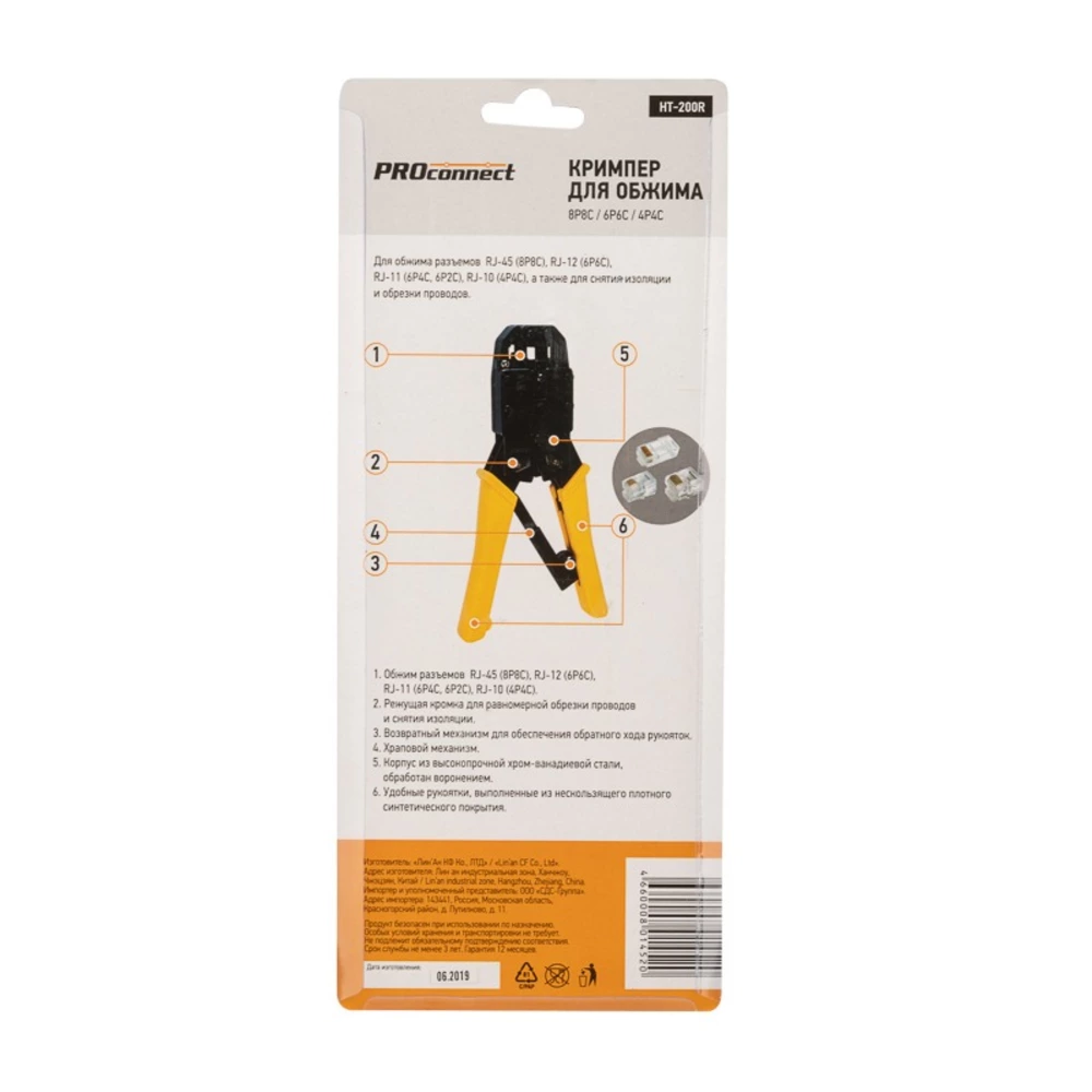 Кримпер PROconnect HT-200R — универсальный инструмент для обжима разъемов RJ-45 (8P8C), RJ-12 (6P6C), RJ-11 (6P4C и 6P2C) и RJ-10 (4P4C), а также для снятия изоляции и обрезки проводов. Особенности: - Корпус выполнен из высокопрочной закаленной инструментальной стали. - Режущая кромка для равномерной обрезки проводов и снятия изоляции. - Возвратный механизм для обеспечения обратного хода рукояток. - Храповой механизм гарантирует полный цикл качественной опрессовки. - Удобные рукоятки с нескользящим плотным синтетическим покрытием сделают работу с инструментом легкой и приятной.
