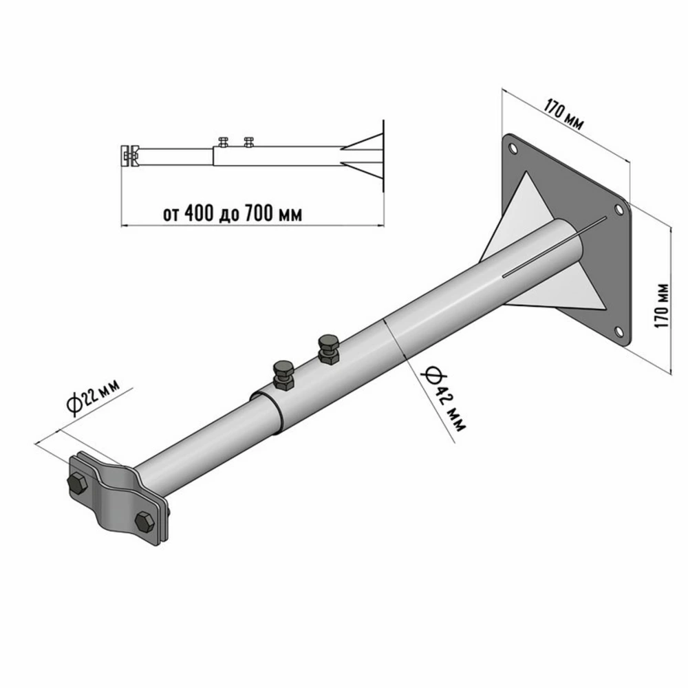Телескопический кронштейн применяется для установки мачты на балконы, оконные рамы, стены строений, фасады зданий и сооружений. Регулировка выноса кронштейна позволяет подобрать необходимый вылет крепления мачты к стене. Крепление мачты антенны на кронштейн поможет существенно улучшить качество принимаемого сигнала и избавит от помех, вносимых различными электронными устройствами, а также стенами и крышами домов. Кронштейн изготовлен из стали, окрашенной специальной порошковой краской, обеспечивающей защиту от внешних факторов и долгий срок службы в неблагоприятных условиях окружающей среды. Изготовлен с учетом специфики российского климата. Технические характеристики: Конструкция: телескопическая Вылет от стены: 40-70 см Максимальный диаметр зажимаемой трубы: 64 мм Толщина стенки трубы: 1,5мм Толщина площадки: 2,00 мм Производство: Россия