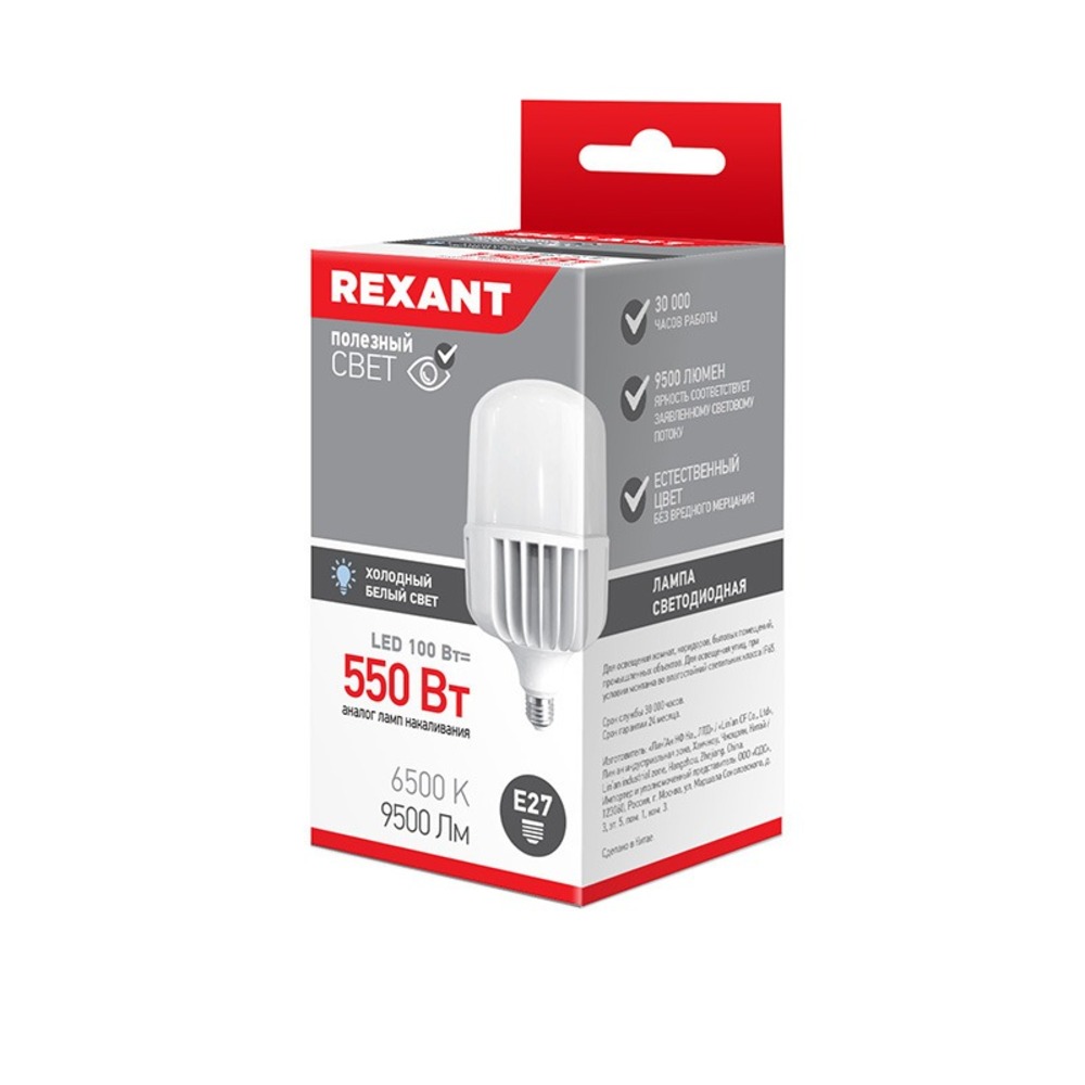 Лампа светодиодная высокомощная 100 Вт E27 с переходником на E40 9500 Лм 6500 K холодный свет REXANT Большая гарантия – 2 года Самый востребованный ассортимент 100 Вт Высококачественный ПЕРЕХОДНИК на цоколь Е40 в комплекте Высокая светоотдача 9500 Лм Низкая пульсация <5% Высокая цветопередача Ra >82 Широкий диапазон рабочих напряжений AC 175-280 В