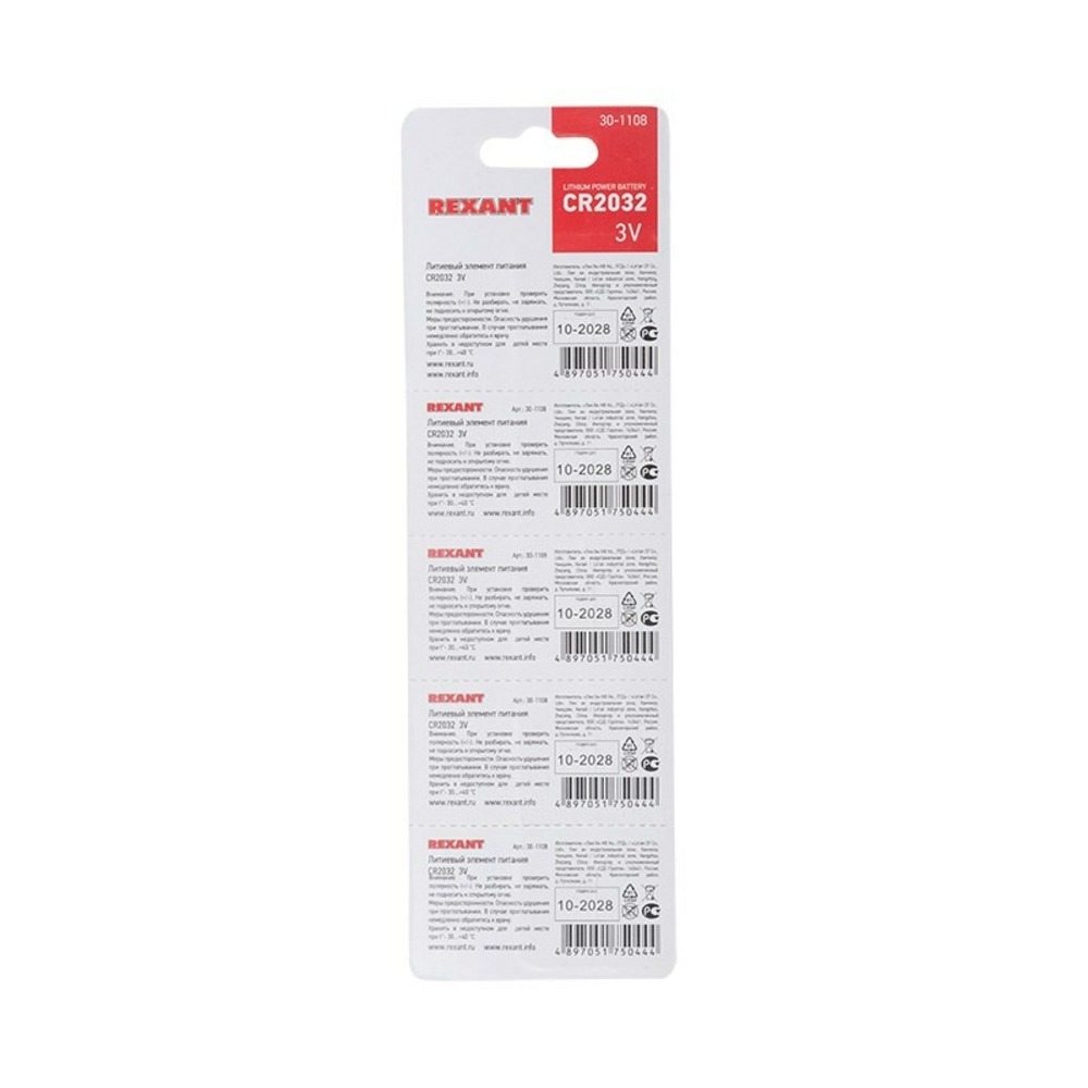 Литиевые батарейки CR2032 REXANT нужны для небольших электронных устройств: часов, весов, калькуляторов, брелоков, медицинских приборов (термометров и пр.) Характеристики товара: напряжение 3 В; 5 штук в упаковке; низкий саморазряд;